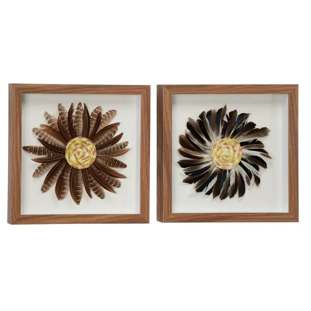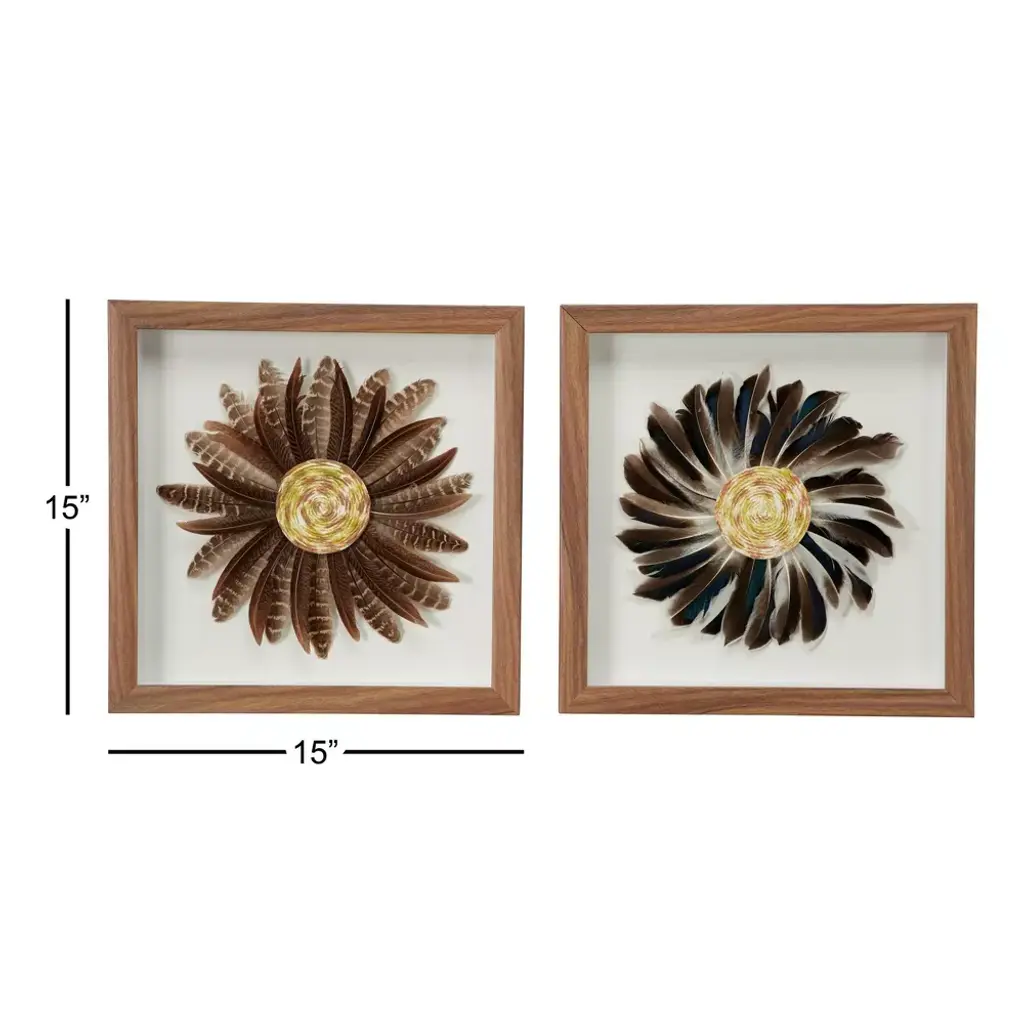 (Set Of 2) 15" X 15" Eclectic Style Feather Shadow Box Wall Decor In Square Wood Frames Brown And Black - Olivia & May