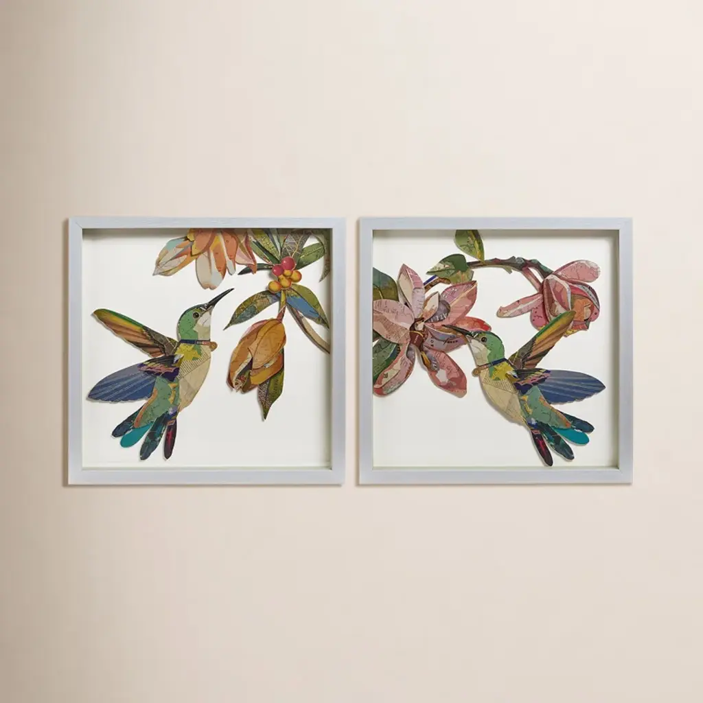 Bring eclectic style to your walls with this set of natural feather art wall decor, featuring brown, white, and black bird feathers with dark gold and chartreuse green striped spirals. Each feather sculpture is secured to a solid white paper backing to really make them pop, along with a natural organic touch from the golden brown, textural wood frame. Side by side or separated, these eclectic wall décor pieces bring natural 3D style to your space.