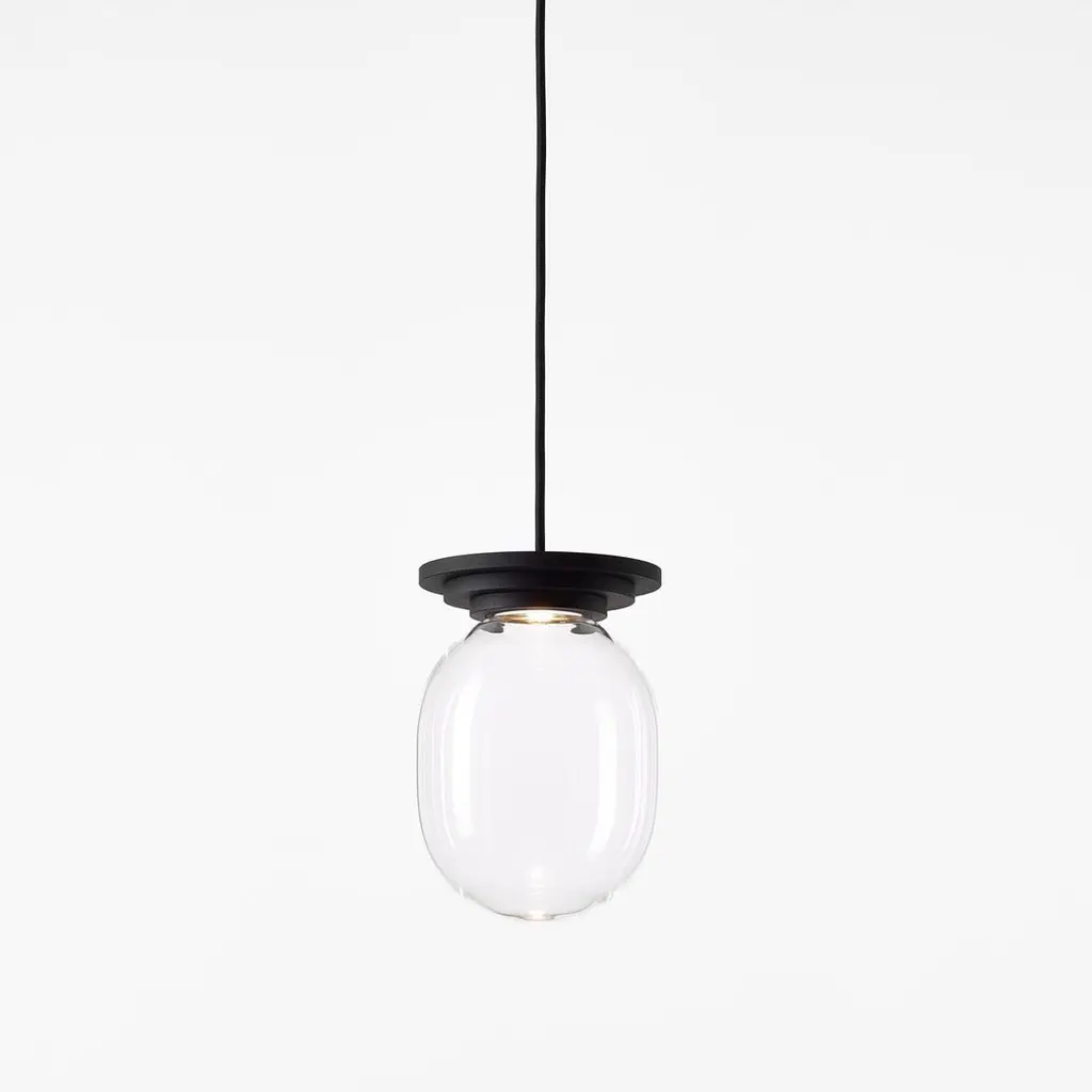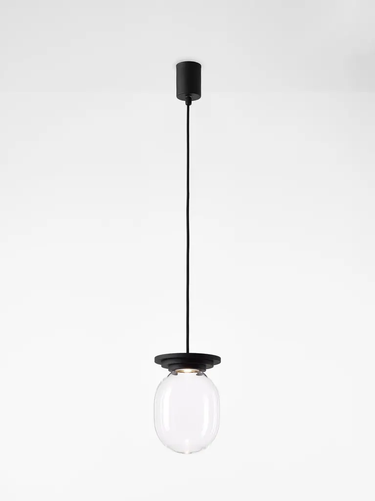 Set of 2 black and clear stratos big capsule pendant light by Dechem StudioDimensions: D 20 x H 28 cmMaterials: Aluminium glass.Also available: Different colours available,Different shapes of capsules and spheres contrast with anodized alloy fixtures, creating a surprising architectural element. The luminaires are available in various colours including crystal clear, smoke grey, alabaster white, pink, green and orange.Glass, just like people or trees, is perfectly capable of being shaped and formed. One can imprint just about anything into it, give it a form, and capture a passing moment, breath a new life into it. Later it stiffens and freezes like a petrified fossil, like magma, like a witness. No one can move it. It is solid as a rock and if you urge it, it rather shatters into pieces than to surrender.We are DECHEM.We are Michaela and Jakub, designers and storytellers in Bohemian glass. Our work is based on contemporary design combined with a mastery of production and a healthy respect for old Central European Craft and traditions.We design, produce and sell our collections of lights and decorative glass products. We produce unique light fixtures made from a combination of mouth-blown glass and handcrafted brass. Our glamorous chandeliers light up any space with a playful yet elegant appearance.A significant component of our work is blowing glass into a colour gradient. The wide range of fresh gradient colours is a distinctive feature of the Bandaska vase from our collection. It draws inspiration from traditional milk containers, well-known in Czech village households, and their elegant lines are now coming into modern homes in the form of our glass vases and lights.In addition to our normal production, we love to devise bespoke luminous objects for interiors. They arise from experimenting with unconventional materials and unusual combinations.Along with our own work, we like to be part of special collaborations and exhibitions. We have collaborated with renowned galleries and institutions, and curated and exhibited projects in Milano, London, Frankfurt, Istanbul and several other cities around the world.All of our creations are manufactured with care in Czech workshops using unique methods, including hand-blowing, snapping, cutting, grinding, firing, engraving and glass painting.We founded DECHEM studio in Prague in 2012 as partners in both work and life after years of studying glass Craft and design, and we have grown it into a renowned and award-winning design studio.