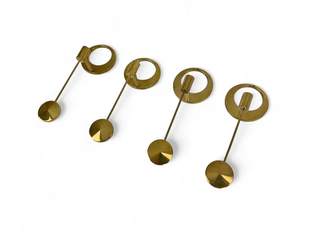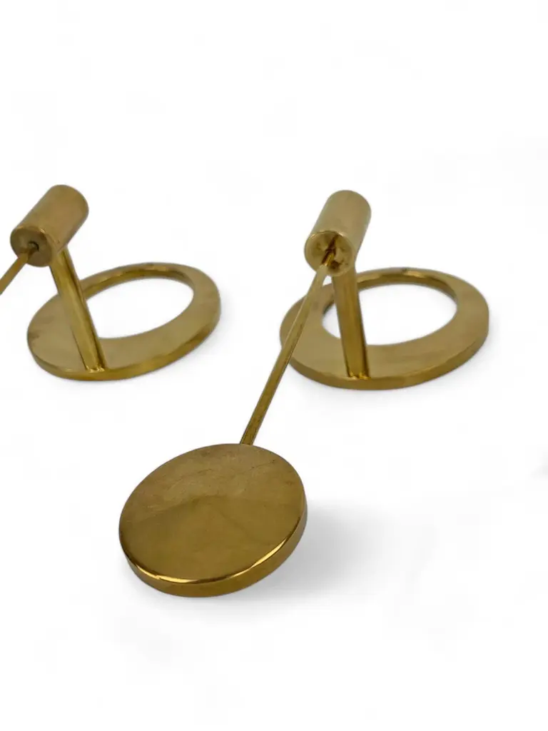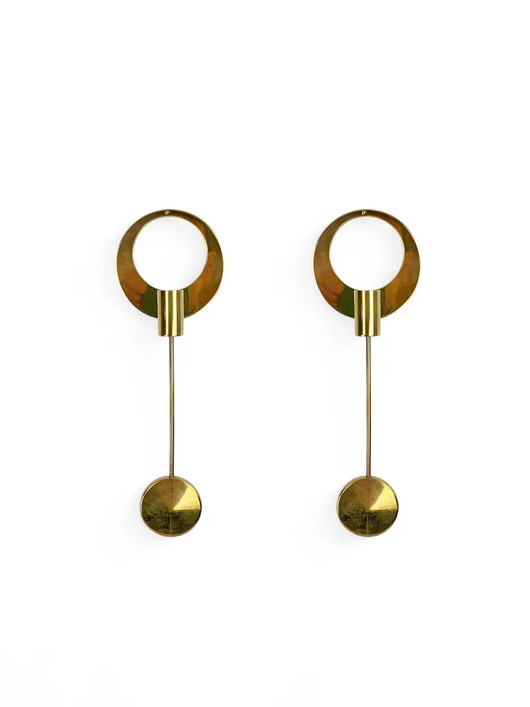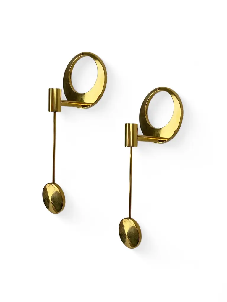 A set of 2 Modernist candle-holders in solid brass, made in the 1960-70s.Circular wall base, the socket fixed in a pendulum. To be used with so-called "Nordic" candles of +/- 12mm diameter, or just as a wall decoration.Signed on the back. 2 pairs are available. Very nice condition with beautiful patina.Created and made by Arthur Pettersson The artist was born in 1919 in Kolbäck, Sweden, where he lived and worked all his live. He signed his candleholders “Arthur Pe Kolbäck”.Arthur Petterson had a training as a metalworker and started his own business “Arthur Petterssons Mekaniska Verkstad” in 1952 in the basement of his house. From that moment on he designed and produced brass candle-holders in his workshop. He continued this activity all his life, he didn’t retire, he just continued to create and produce brass candle-holders. Arthur Pettersson was 96 when he died on July 28, 2015.