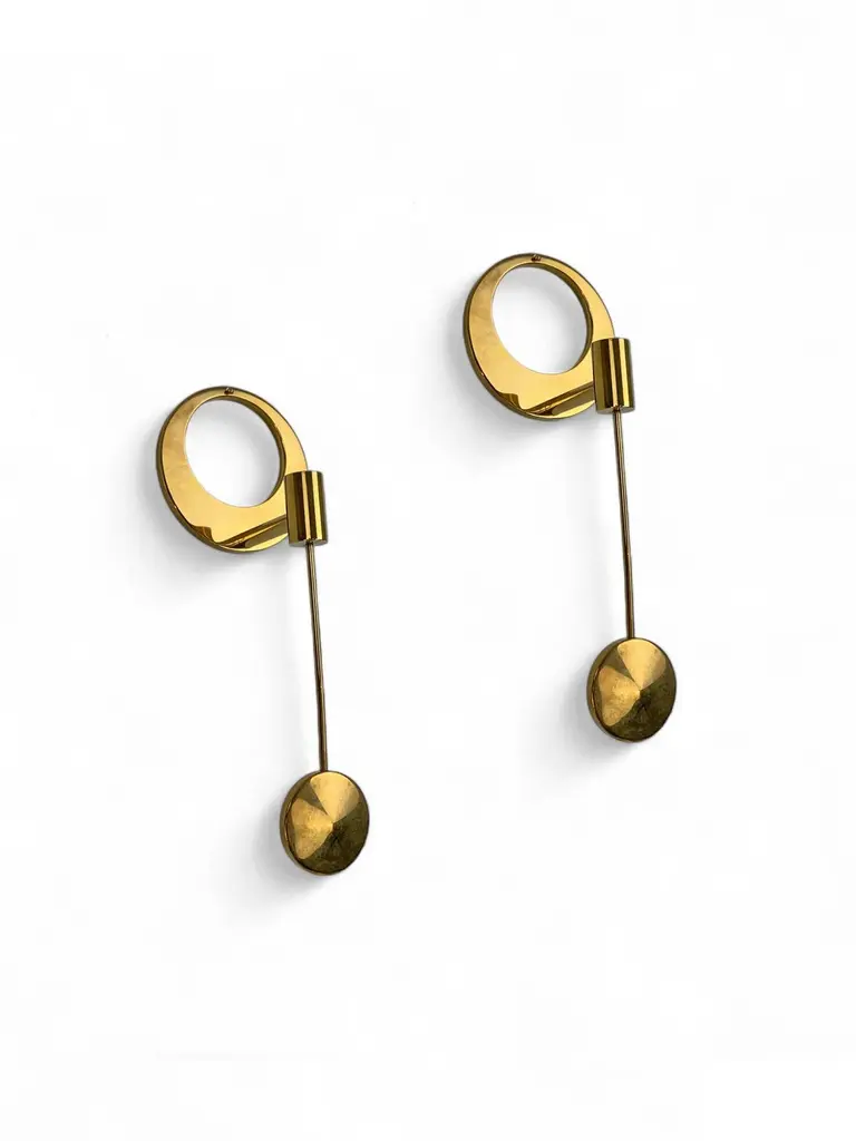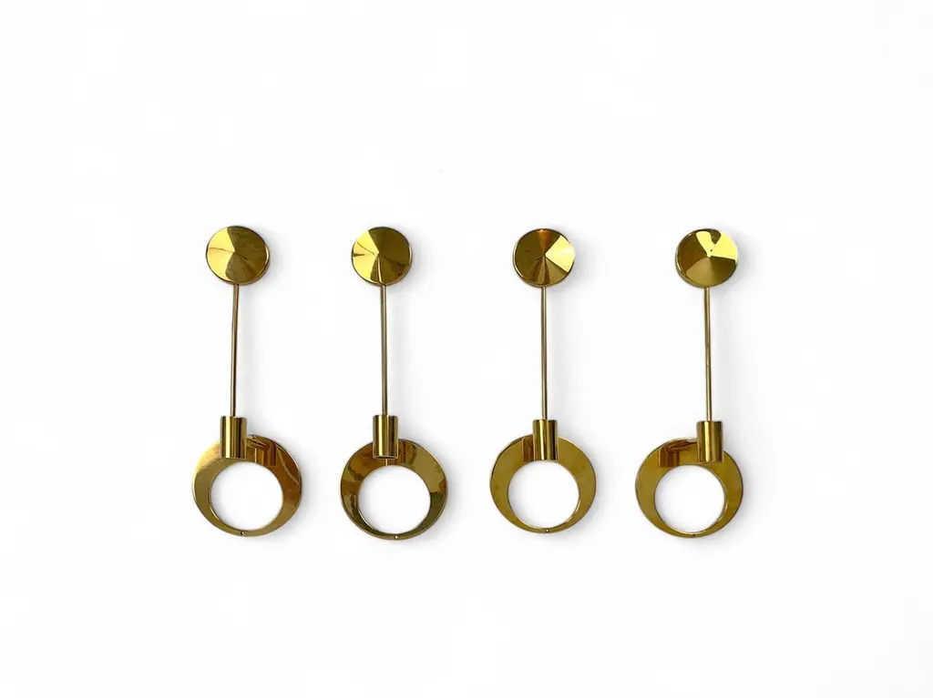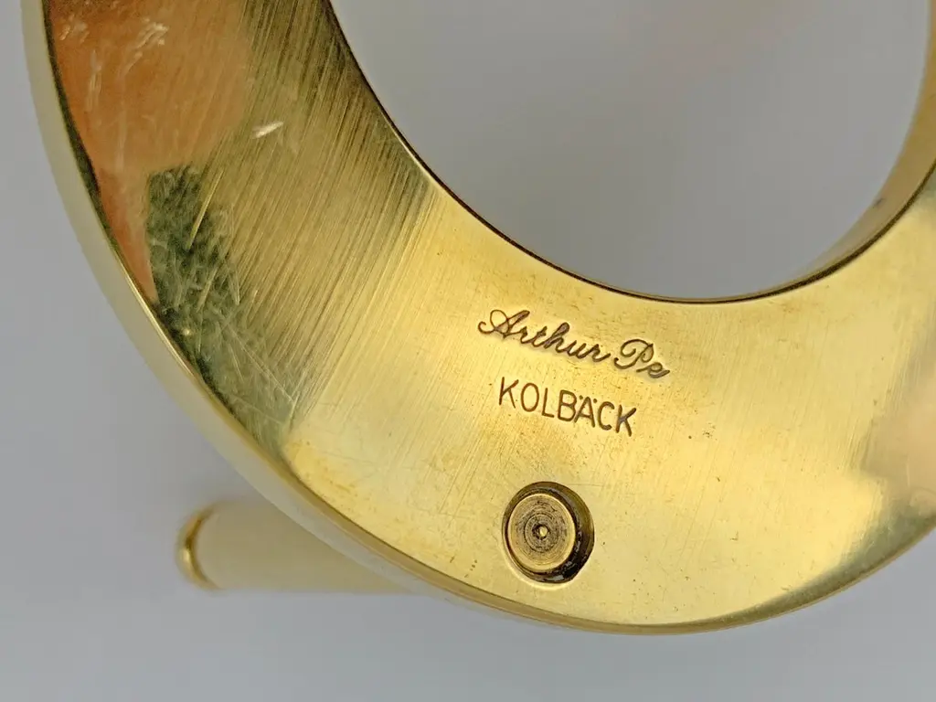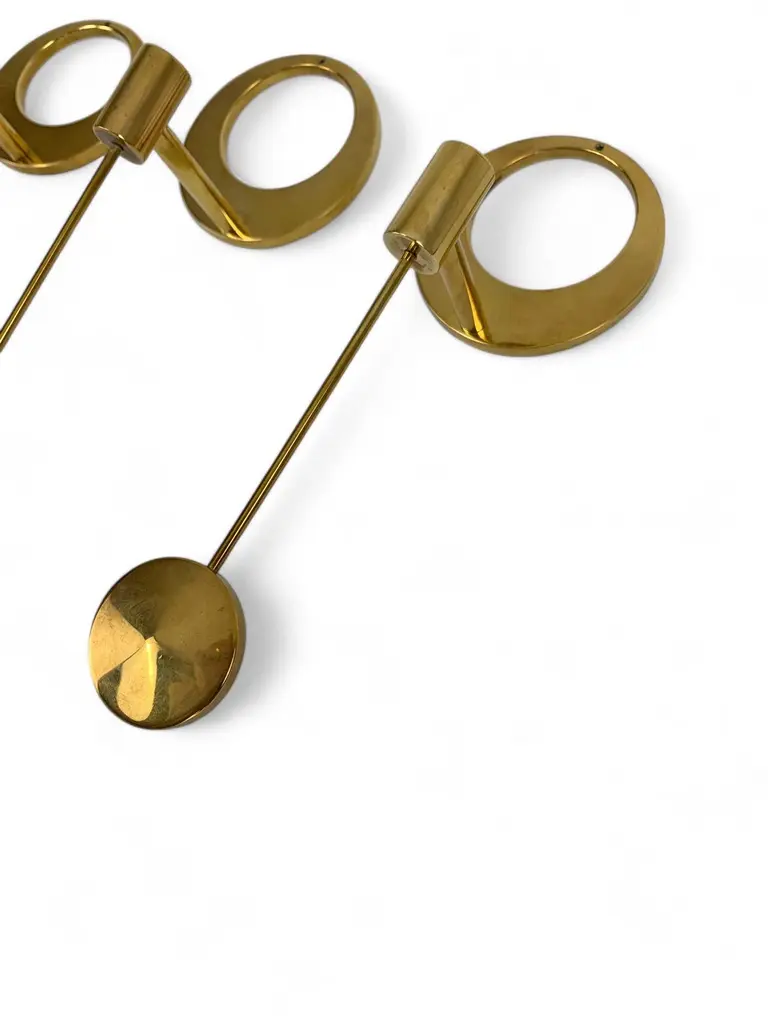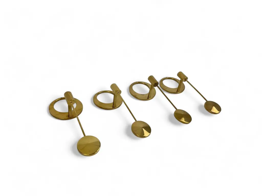 A set of 2 Modernist candle-holders in solid brass, made in the 1960-70s.Circular wall base, the socket fixed in a pendulum. To be used with so-called "Nordic" candles of +/- 12mm diameter, or just as a wall decoration.Signed on the back. 2 pairs are available. Very nice condition with beautiful patina.Created and made by Arthur Pettersson The artist was born in 1919 in Kolbäck, Sweden, where he lived and worked all his live. He signed his candleholders “Arthur Pe Kolbäck”.Arthur Petterson had a training as a metalworker and started his own business “Arthur Petterssons Mekaniska Verkstad” in 1952 in the basement of his house. From that moment on he designed and produced brass candle-holders in his workshop. He continued this activity all his life, he didn’t retire, he just continued to create and produce brass candle-holders. Arthur Pettersson was 96 when he died on July 28, 2015.