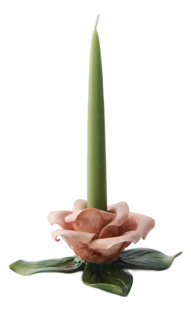 This exquisite set of two candle holders artfully captures the elegance and delicacy of a blooming rose. Skillfully crafted from fine ceramics, each holder features a meticulously designed rosebud that cradles a candle within. The harmonious opening of the petals creates a natural and enveloping aesthetic, while the intricately detailed outer leaves enhance the overall charm and sophistication of the design. Each piece is unique, showcasing the craftsmanship and beauty inherent in the ceramic form. Ideal for infusing a romantic and refined atmosphere into any setting, these items serve as both functional decor and captivating art pieces.