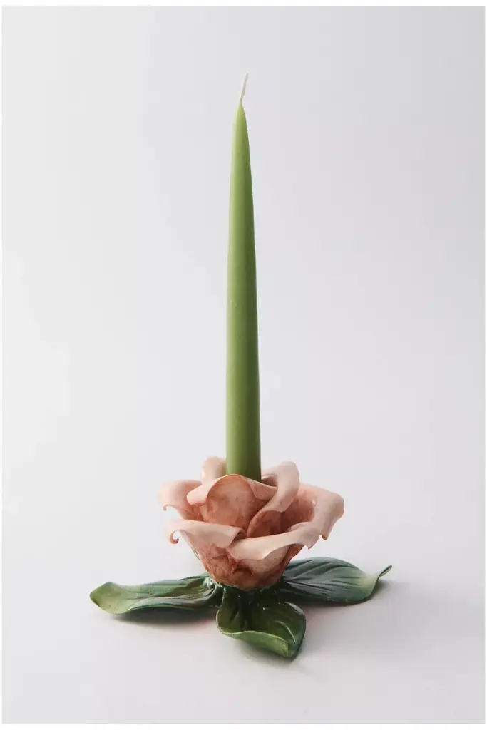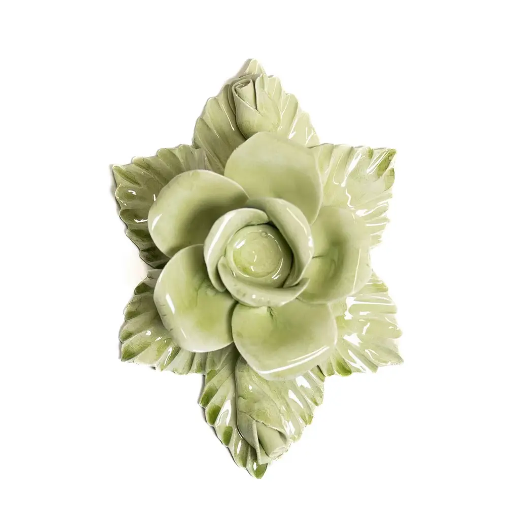 Set Of 2 Green Rose-Shaped Ceramic Candle Holders