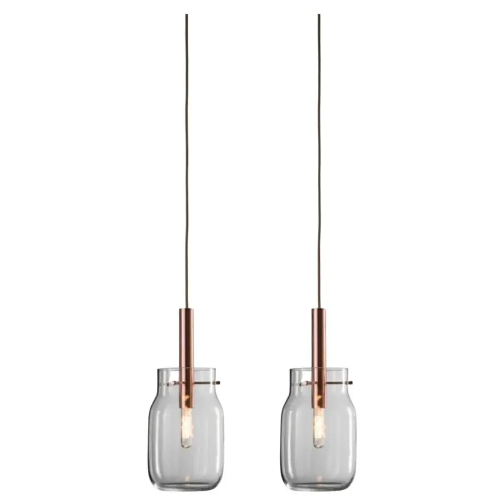 Set of 2 smoke grey Tetris pendant light by Dechem StudioDimensions: W 30 x D 23 x H 200 cmMaterials: Metal, glass.Also available: Different colours available,In this complex lighting fixture, strict geometric and architectural lines contrast with the organic and natural surface of the glass which is uneven and wrinkled from contact with the metal mold during production. These stacked cubes of glass are produced in different colours, including smoke grey, poppy red, clear glass, cobalt blue and alabaster white, always combined with a solid matte black fixture.Glass, just like people or trees, is perfectly capable of being shaped and formed. One can imprint just about anything into it, give it a form, and capture a passing moment, breath a new life into it. Later it stiffens and freezes like a petrified fossil, like magma, like a witness. No one can move it. It is solid as a rock and if you urge it, it rather shatters into pieces than to surrender.We are DECHEM.We are Michaela and Jakub, designers and storytellers in Bohemian glass. Our work is based on contemporary design combined with a mastery of production and a healthy respect for old Central European Craft and traditions.We design, produce and sell our collections of lights and decorative glass products. We produce unique light fixtures made from a combination of mouth-blown glass and handcrafted brass. Our glamorous chandeliers light up any space with a playful yet elegant appearance.A significant component of our work is blowing glass into a colour gradient. The wide range of fresh gradient colours is a distinctive feature of the Bandaska vase from our collection. It draws inspiration from traditional milk containers, well-known in Czech village households, and their elegant lines are now coming into modern homes in the form of our glass vases and lights.In addition to our normal production, we love to devise bespoke luminous objects for interiors. They arise from experimenting with unconventional materials and unusual combinations.Along with our own work, we like to be part of special collaborations and exhibitions. We have collaborated with renowned galleries and institutions, and curated and exhibited projects in Milano, London, Frankfurt, Istanbul and several other cities around the world.All of our creations are manufactured with care in Czech workshops using unique methods, including hand-blowing, snapping, cutting, grinding, firing, engraving and glass painting.We founded DECHEM studio in Prague in 2012 as partners in both work and life after years of studying glass Craft and design, and we have grown it into a renowned and award-winning design studio.