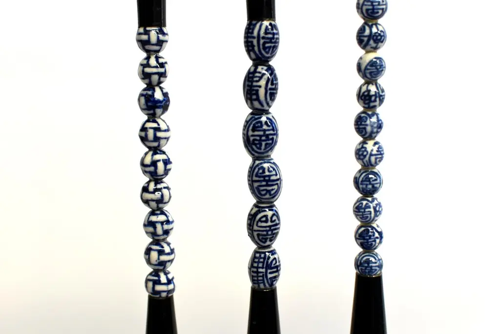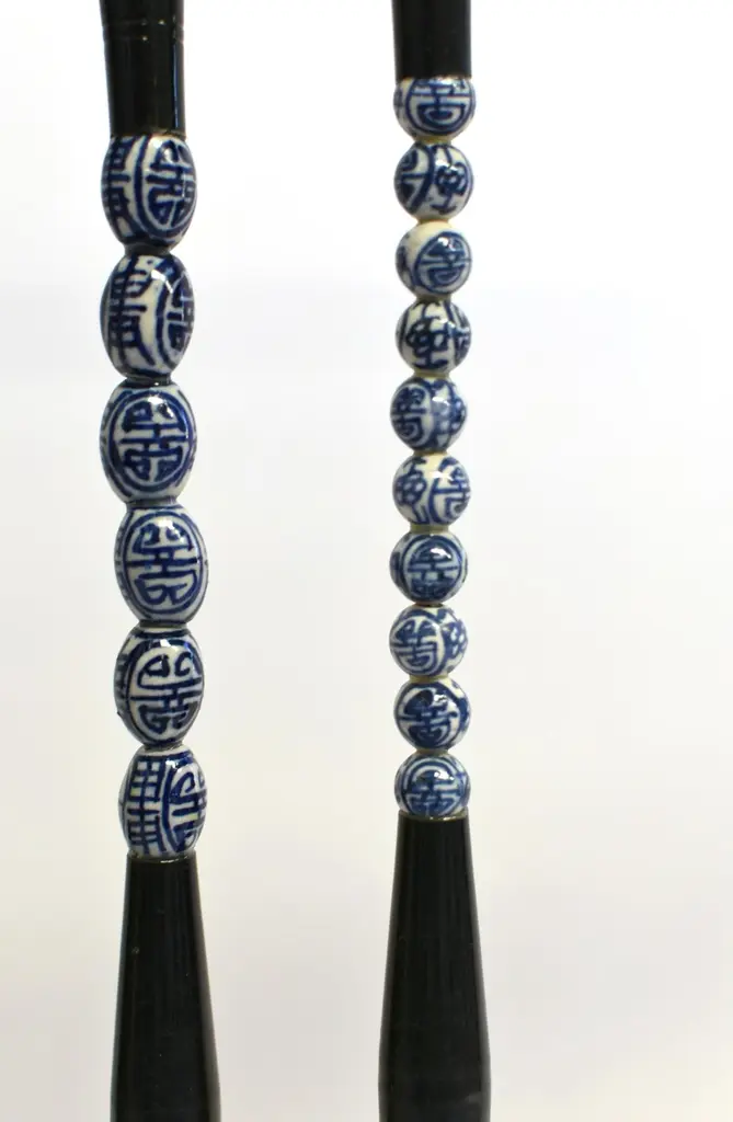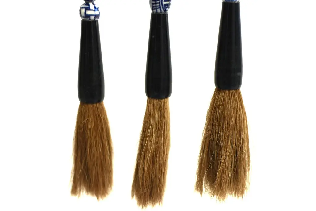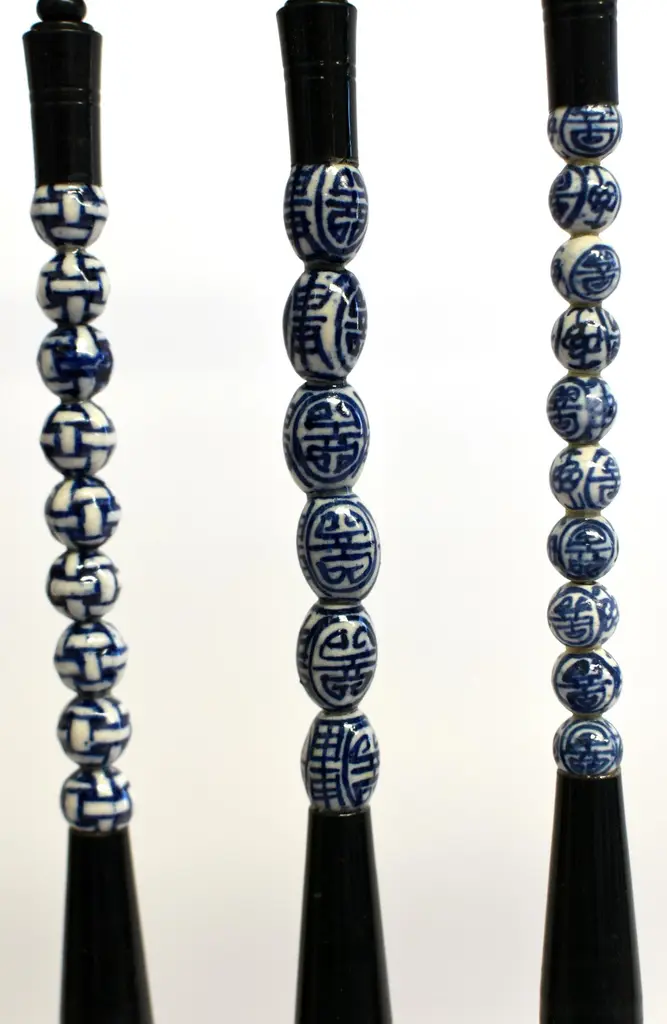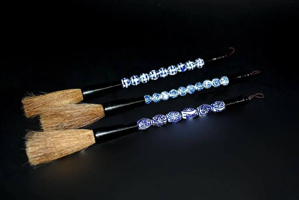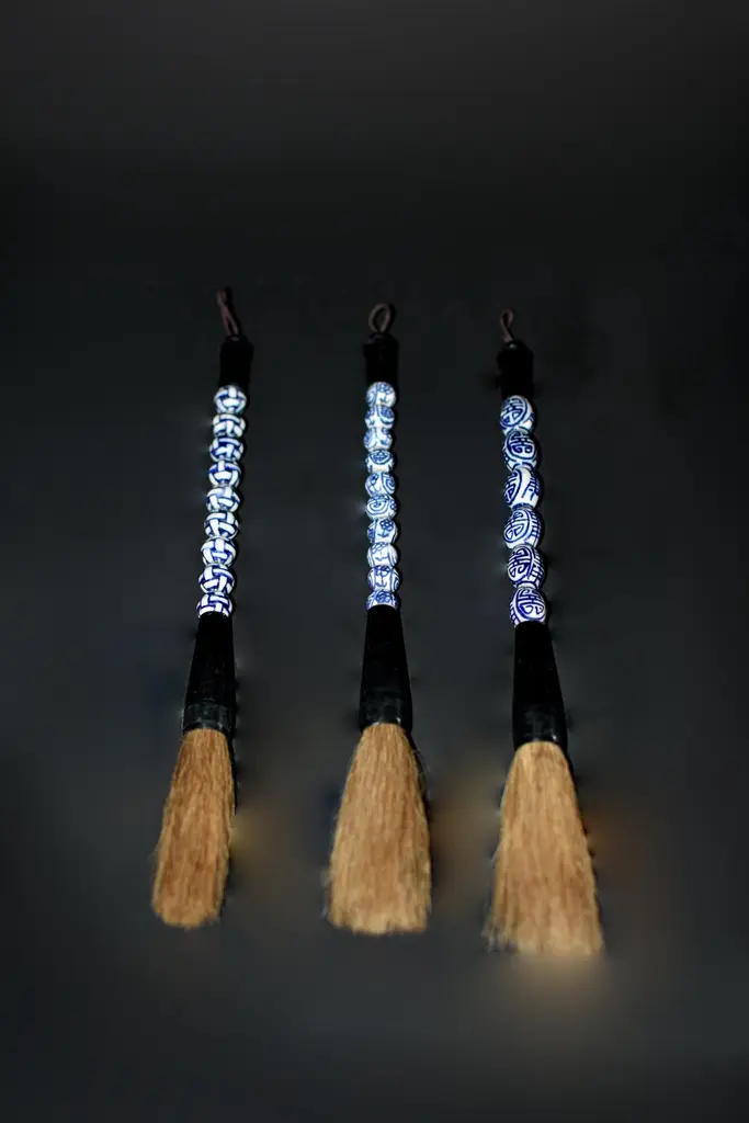 A set of 3 beautiful porcelain handle Chinese calligraphy brushes. The handles with hand painted round and oval porcelain balls of longevity motifs and basketweave, in classic, timeless blue and white. Horse hair. These are excellent brushes for painting and calligraphy use, or as interior design elements.