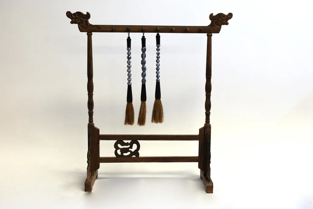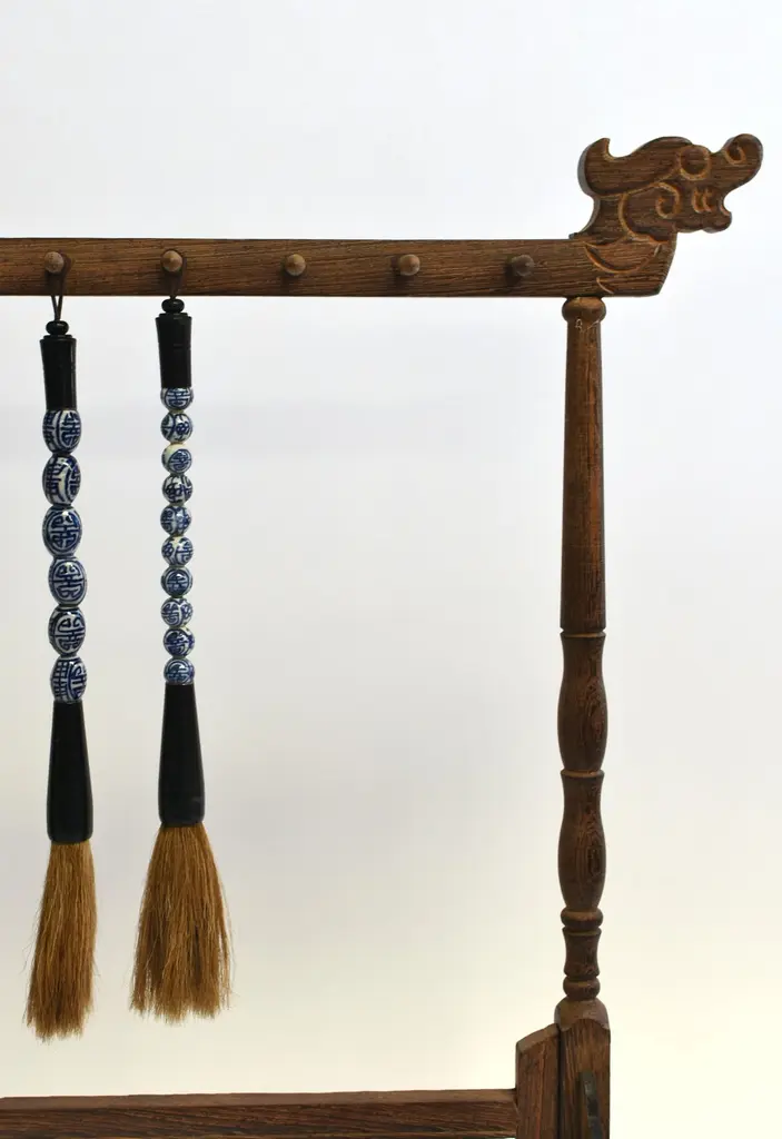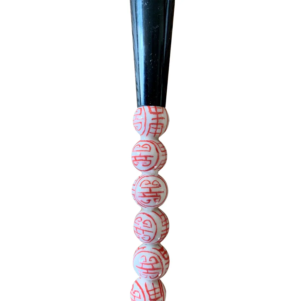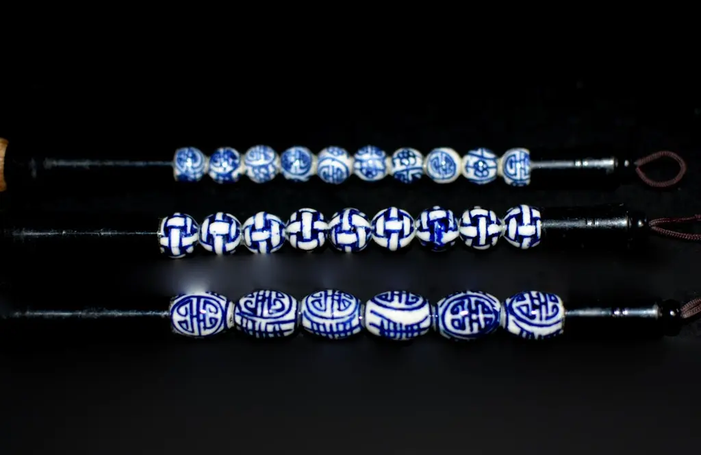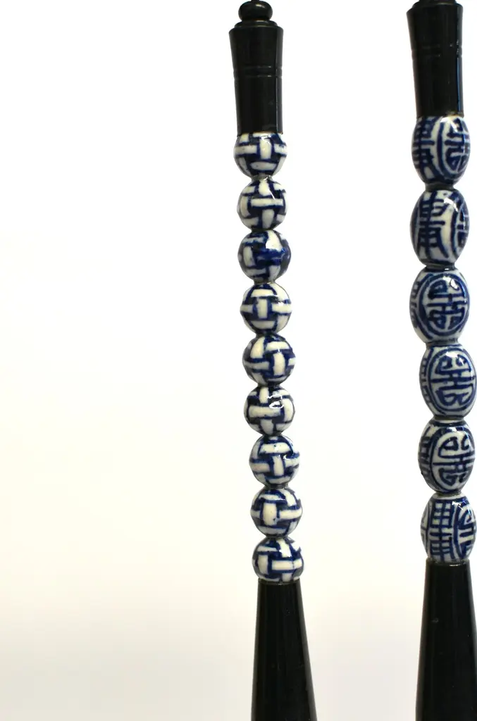 A set of 3 beautiful porcelain handle Chinese calligraphy brushes. The handles with hand painted round and oval porcelain balls of longevity motifs and basketweave, in classic, timeless blue and white. Horse hair. These are excellent brushes for painting and calligraphy use, or as interior design elements.