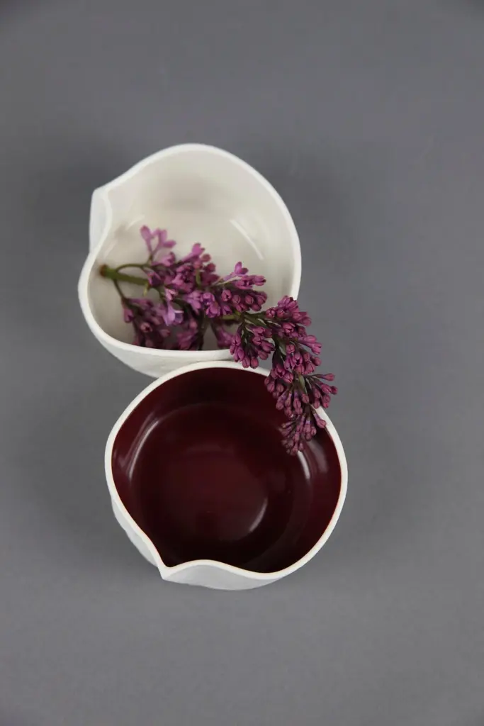 An organic shaped porcelain dish with a tactile exterior surface and a smooth glazed interior. Small & precious, yet surprisingly practical, the Kawa Dishes are equally well-suited as a jewelry dish, salt cellar, sauces & dips bowl. As a result of the production process each piece is one-of-a-kind. Sold as a set of 3. All finishes are food-safe and dishwasher-safe.Dimensions3.5" diameter x 1.5" heightMade to order. Signed and dated.The Kawa Series is a collection of porcelain objects that are made by casting liquid clay into sewn leather molds. The precarious and beautifully-involved process is completely unique to Luft Tanaka Studio, and results in truly one-of-a-kind art objects. All pieces are handmade in Brooklyn at Luft Tanaka Studio.Each Kawa piece starts as a sketch on paper. With the assistance of a 3-D modeling program, Luft creates patterns to be cut out of leather. After the leather mold, which can be reused about a dozen times, is sewn and prepared, liquid porcelain is poured inside. As the porcelain sits inside the mold, it forms a thin wall along the leather surface picking up the leather texture and organic form from the flexible leather mold. Once dry, the leather mold is carefully cut open using a seam ripper and delicately peeled off the piece which is then carefully finished by hand.