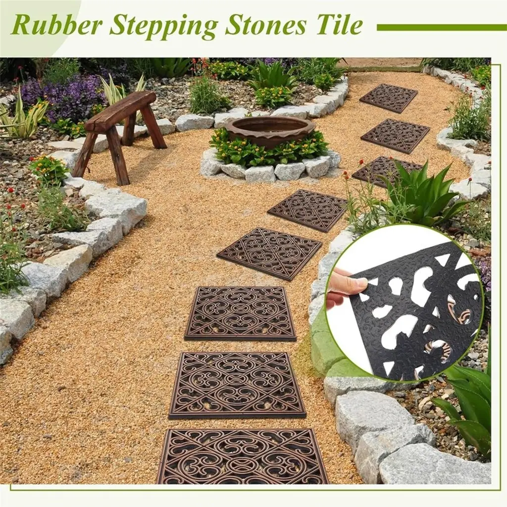 Place these charming stepping stones along a path for a well-marked garden walk. Crafted of durable, partially recycled rubber, these markers will withstand extreme weather conditions in any season. Set of 3 rubber stepping stones resemble wood cuts with a metallic finish that contrasts nicely with the black base. Sturdy yet lightweight and easy to move around your yard. Use them anywhere you want to mark a path or have some attractive artwork underfoot, such as lawn, yard, flower bed and more.