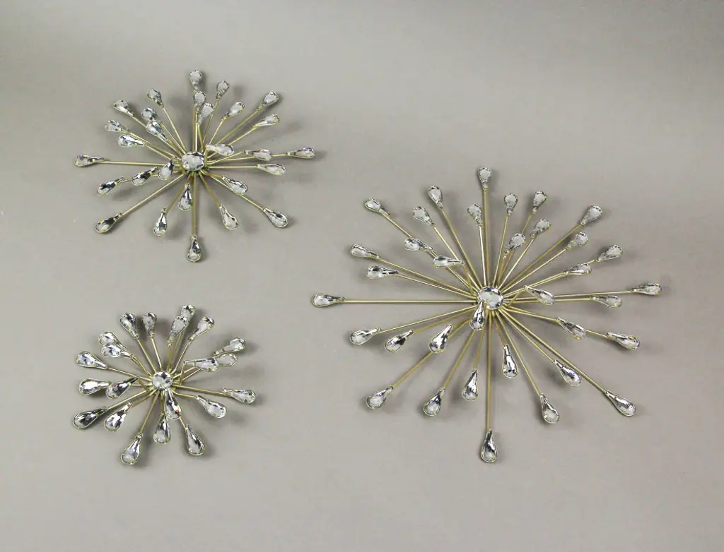 Overall Size - Large - These starbursts are generously sized, measuring 12 inches in diameter with a substantial 1.5-inch depth, adding a captivating focal point to your wall decor. The medium starbursts have a diameter of 9 inches, and the small ones measure 6 inches in diameter, each with the same impressive depth of 1.5 inches.Durable Material - Crafted with utmost precision and care, these starbursts are made of high-quality metal, ensuring years of maintenance-free display. The sturdy construction guarantees long-lasting durability, making them a valuable addition to your home decor collection.Eye-Catching Decor - The polished gold-tone finish of these starbursts emanates a warm, inviting glow that brightens up any room. The intricate design, coupled with the brilliant golden hue, creates a mesmerizing visual appeal. These starbursts are not just decorations; they are statements, adding sophistication and charm to your living spaces.Easy to Hang - Featuring triangular metal hangers securely mounted on the back of each sculpture, these starbursts are incredibly easy to hang. The sturdy design ensures hassle-free installation, allowing you to effortlessly transform your room within minutes. Arrange them as a cluster or space them out; their flexibility enhances your creative freedom.Decorative Accent - These starbursts serve as exquisite decorative accents, adding a crystal burst of starry elegance to any room they adorn. Whether placed in your living room, bedroom, or hallway, they infuse a touch of glamour and sophistication, elevating your interior decor to new heights. Enhance your ambiance with these dazzling starburst sculptures, showcasing your impeccable taste in art and design.Illuminate your living space with the mesmerizing radiance of our Gold Tone Wall Accents, evoking the cheerful burst of sunrays adorned with sparkling droplets. Each piece is a testament to unique beauty, reminiscent of splashing rain, floating dandelions, or even the brilliance of fireworks. Composed of metal rods forming a captivating sphere, these wall accents feature teardrop-shaped, faceted clear glass gems that radiate outward from the center, creating a visually exciting and simply stylish impact. The versatility of these wall sculptures allows them to seamlessly integrate into any room, complementing your existing decor. Whether hung individually for a focal point or arranged in a series to achieve a sophisticated and coordinated look, these accents provide a dynamic visual element to your space. The largest sphere boasts a diameter of 12 inches, followed by a medium one at 9 inches, and a charming smaller sphere at 6 inches. With a projection of 1.5 inches from your wall, these sculptures invite dimension and depth into your home. Perfect for those with an appreciation for the unusual and a penchant for mid-century modern style, these Gold Tone Wall Accents infuse your living space with a touch of elegance and artistic flair. Let the radiance of these unique pieces transform your surroundings into a captivating visual masterpiece.