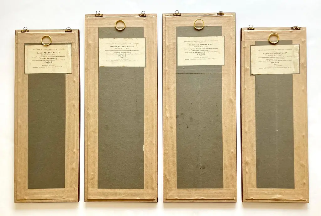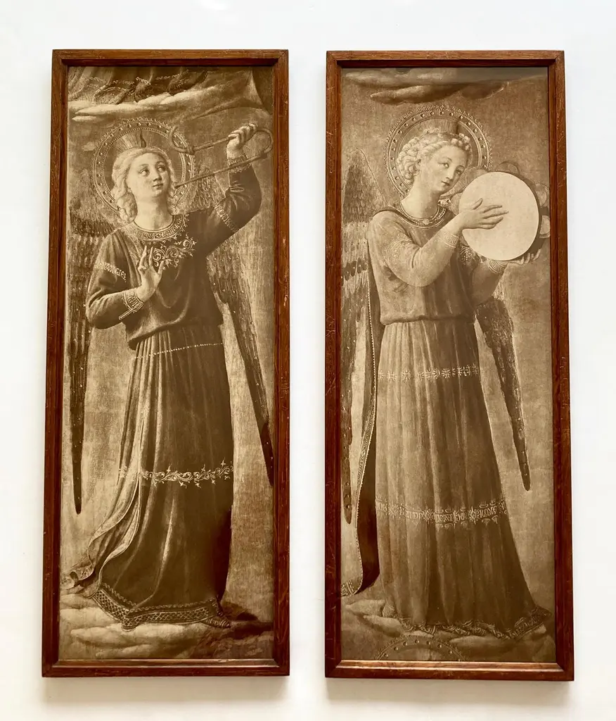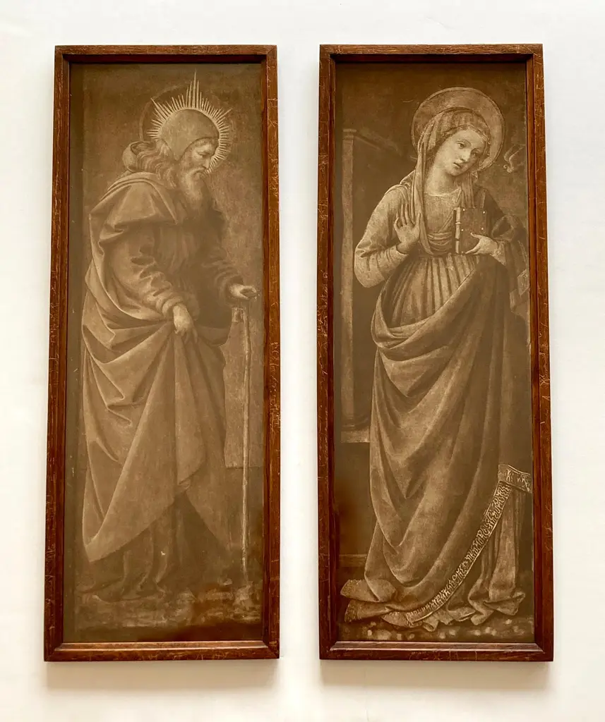 These four original carbon prints have been made by the French publishing house Maison Braun & Cie. (see labels on the backs). The company was launched in 1853 in the town of Dornach, Alsace, France by Adolphe Braun (1812-1877). The company specialized in (large) reproductions of artworks and came to open offices in Paris (1868), London and New York. In 1883 the company, which had been taken over by Adolphe's son and other family members, became the official and sole photographer/publisher for the Louvre Museum in Paris and other stately owned museums in France. They also had a very impressive sale list of images from other reputed European museums and collections. The company was taken over in the 1950s and the brand ceased to exist in 1969. This set consists of four framed, original carbon prints of late middle-age religious paintings by Italian masters. These prints most likely date from late 1800s or early 1900s. The two large angels are sections from the Linaiuoli Triptych, dated 1433 and painted by the Italian artist Fra Angelico (circa 1387-1455). He is often referred to as the "painter of angels". The female saint holding a book is from the artwork "Annunciation" by the Italian painter Fra Filippo Lippi (1406-1469). The origine of the male saint is unfortunately still a mystery despite my research. What is sure is that it is not a work by Fra Angelico nor by Fra Filippo Lippi but rather by a third artist. All four prints have been put under glass and nicely framed in simple, dark, wooden frames. They all have their original hangers as well as new ones. These decorative, original prints are in good antique condition. They show no signs of humidity which can often be the case with old prints. The backs have recently been redone (lining and hangers) however without damaging the original paper labels. The frames show signs of wear (scratches) consistant with age and use (see photos). Sold as a set of four.Dimension larger prints: 50.5 cm/ 19 3/4", width 19.5 cm/ 7 1/2", depth 1.25 cm/ 1/2".Dimension smaller prints: 46.5 cm/ 18", width 17 cm/ 6 3/4", depth 1.25 cm/ 1/2". Approximate dimensions for the suggested layout: height 50.5 cm/ 19 3/4", width 78 cm/ 30 3/4", depth 1.25 cm/ 1/2". Weight as a set of 4: 2975 g/ 6.56 lbs