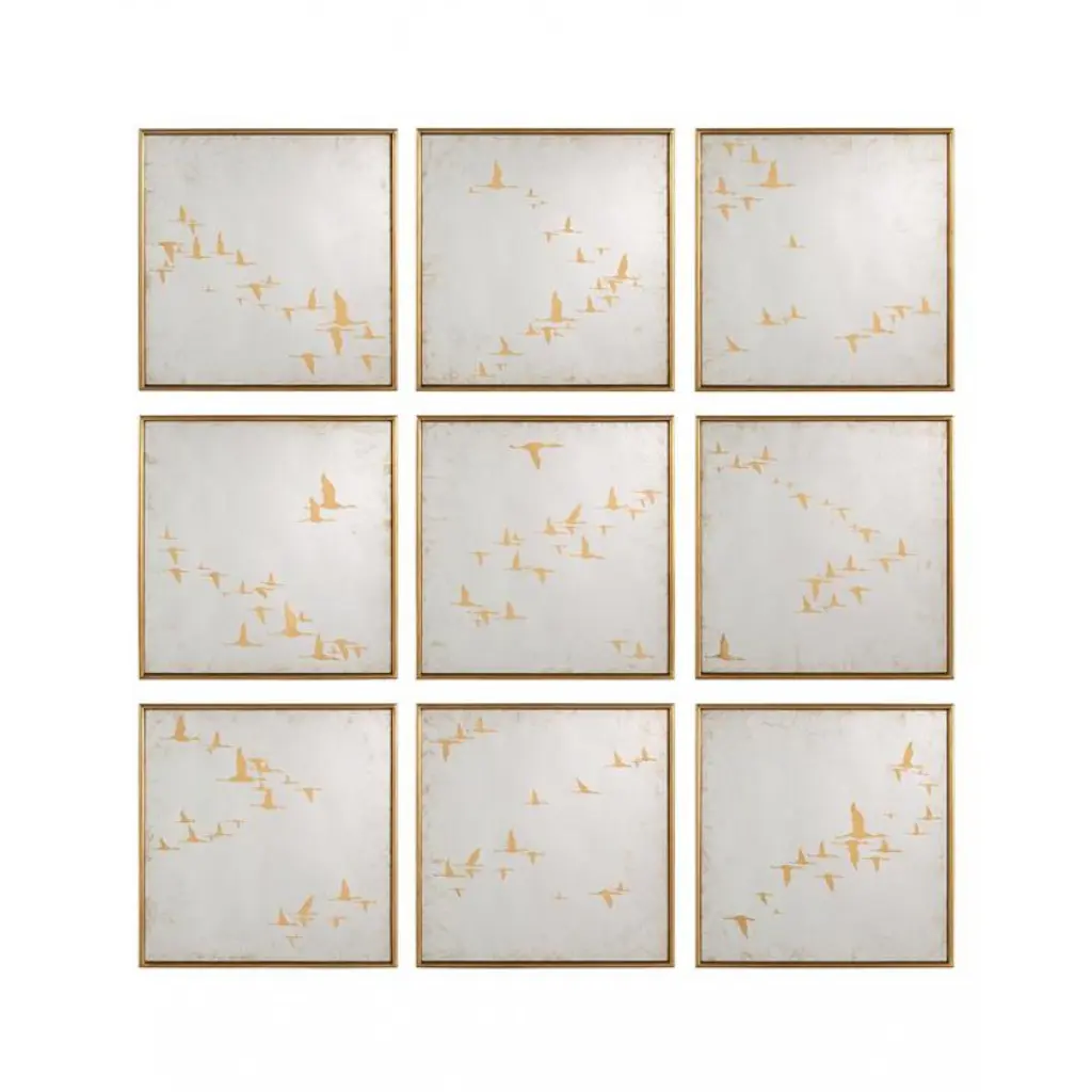 Enchanting and striking, this Golden Birds in Flight Framed Canvas Wall Art is an amazing handcrafted collection suitable for any interior. The gold bird silhouettes add a modern and premium effect to the three artworks, bouncing and reflecting off the canvas base. The quality materials and colours used for this three piece artwork collection add a contemporary aesthetic to the simple yet divine artworks, making it the perfect set for your wall space. This beautiful imagery of golden birds in flight is expertly finished off with a premium metallic gold floating frame, giving the already enchanting piece a more valuable and modern feel to it. The unique style of this Triptych wall art is perfect for any interior. 30" x 48" x 1.37"
