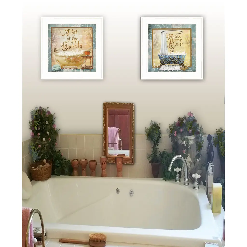 Add an air of fashion to your room and rejuvenate the space with this set of two a bit of bubbly vignette 1 white framed print bathroom wall art. This print is a visual artistic expression that allows you to decorate your space in style. Reproduced for you on paper, this hanging decorative accent will be a trendy and fashionable way to dress your walls. Adding this hanging wall art to your space to make your room feel more finished and attractive. Instantly liven up your space with this art that brings color and dimension to your walls. 15" H x 15" W x 1" D