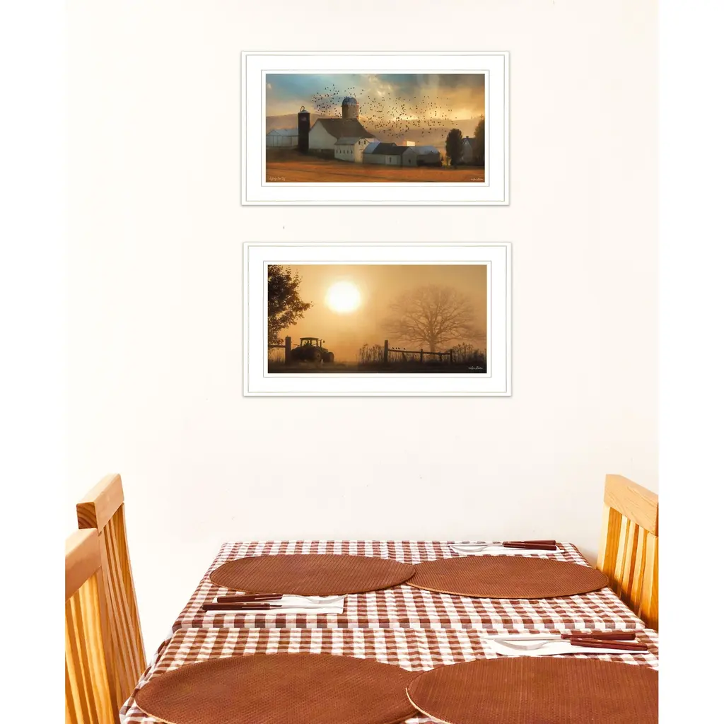 This set of two farm country sunrise white framed print wall art will add a beautiful decorative accent to your decor. This print is a visual artistic expression that allows you to decorate your space in style. Reproduced for you on paper, this hanging decorative accent will be a trendy and fashionable way to dress your walls. Hang on your wall to add some up to date fashion and decoration. Utilize this opportunity to create a focal point in the room with this fabulous wall decor option. 12" H x 21" W x 1" D