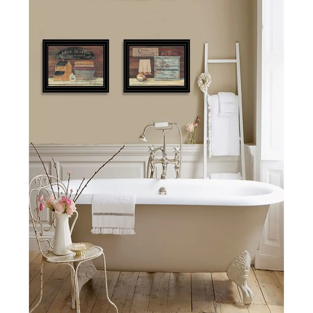 Add an air of fashion to your room and rejuvenate the space with this set of two hot bath or clean towels collection vignette 2 black framed print wall art. This print is a visual artistic expression that allows you to decorate your space in style. Reproduced for you on paper, this hanging decorative accent will be a trendy and fashionable way to dress your walls. Adding this hanging wall art to your space to make your room feel more finished and attractive. Instantly liven up your space with this art that brings color and dimension to your walls. 14" H x 17" W x 1" D