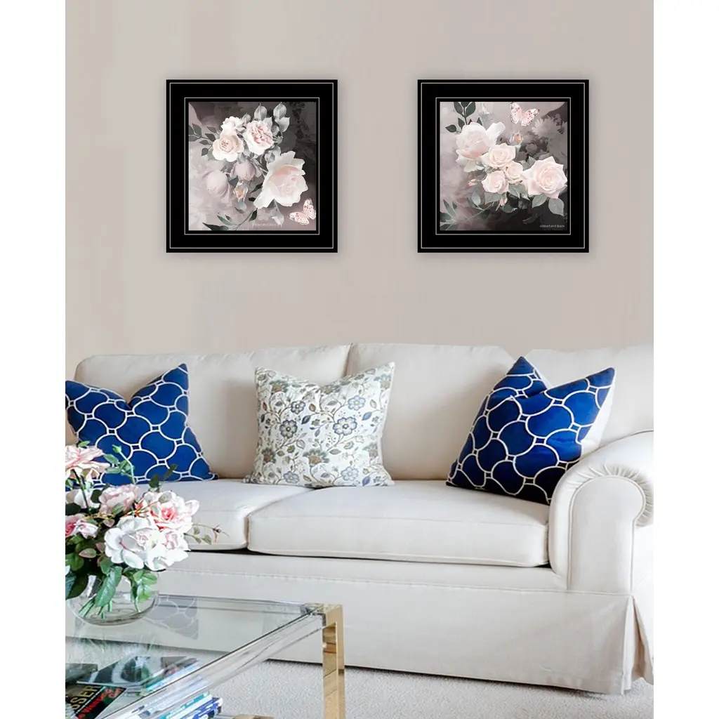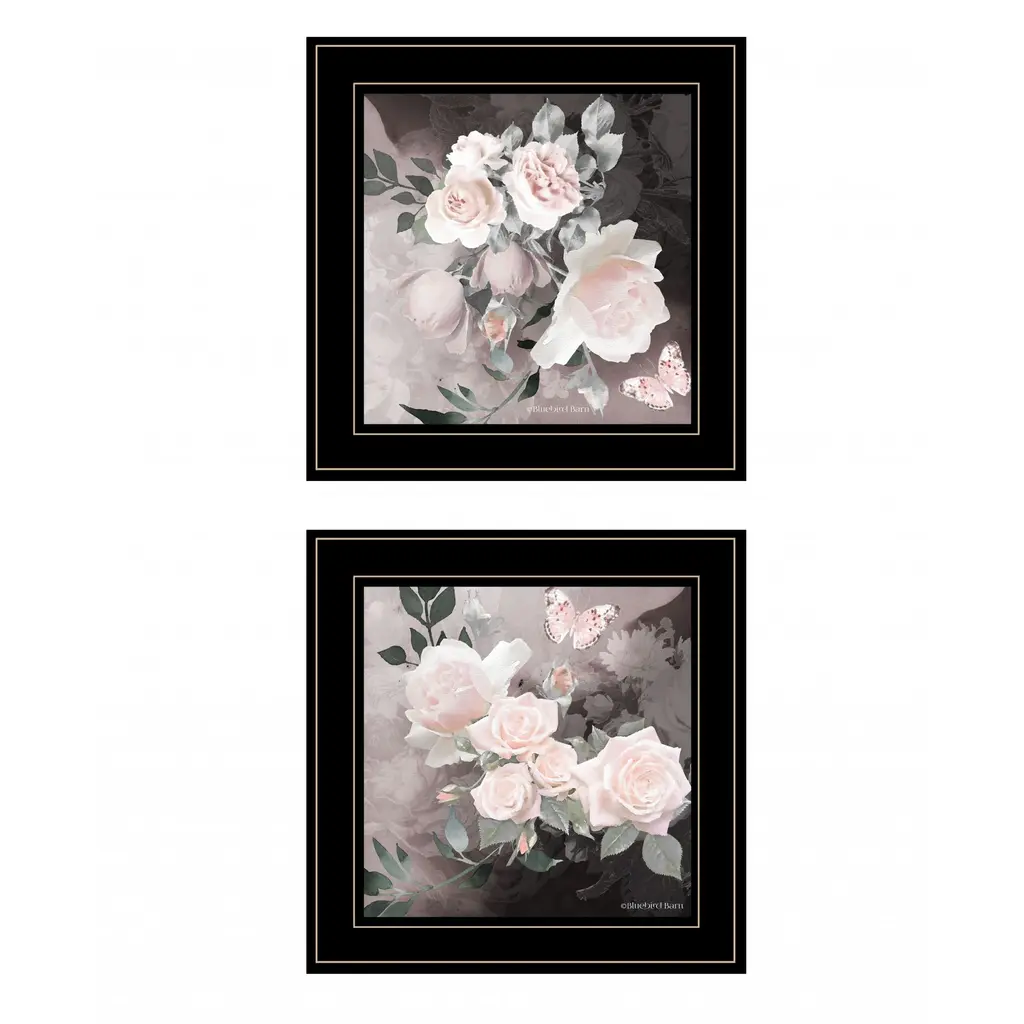 Set Of Two Pink Roses And Butterfly Black Framed Print Wall Art - Black