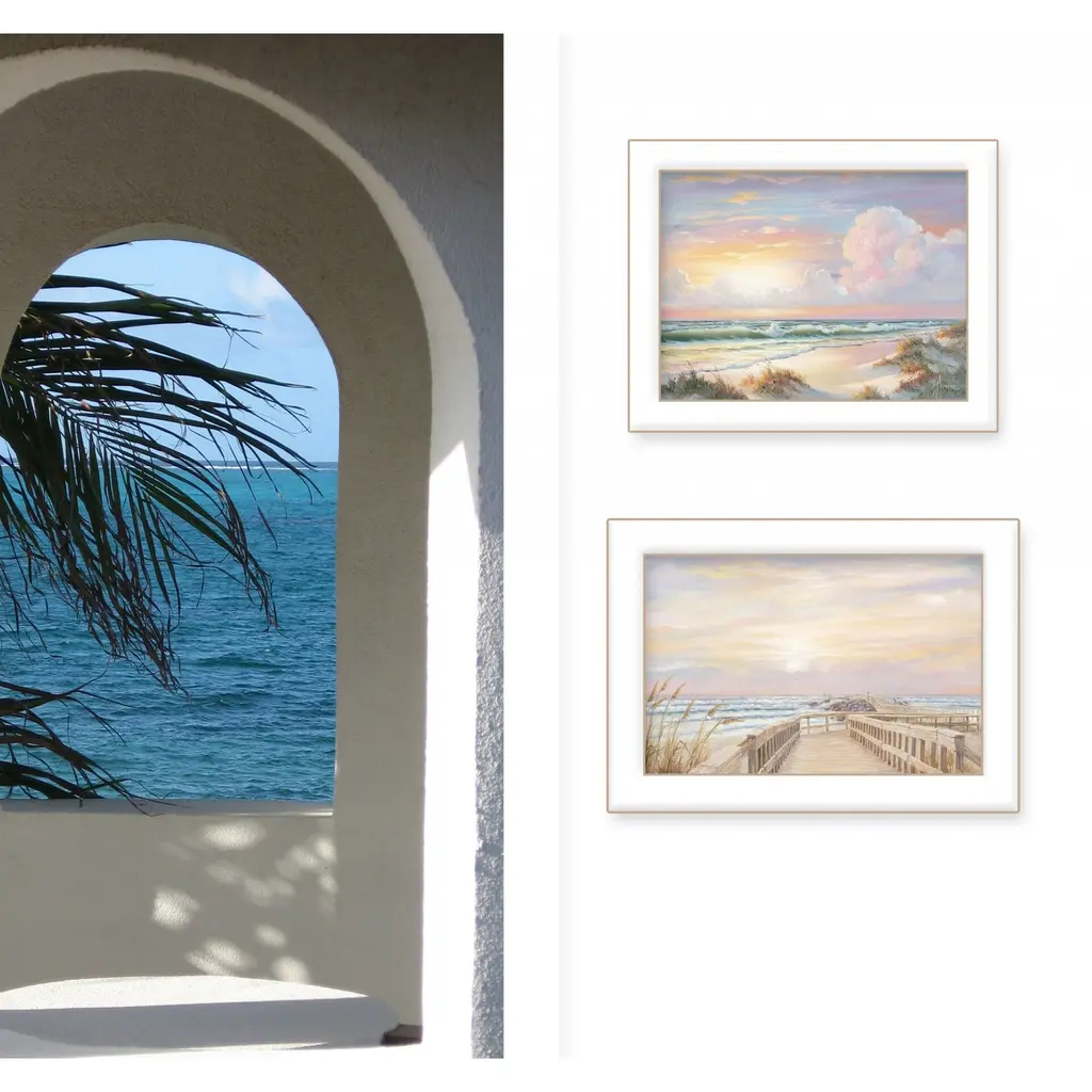 Add an air of fashion to your room and rejuvenate the space with this set of two sunrise-sunset 2-piece vignette 1 white framed print wall art. This print is a visual artistic expression that allows you to decorate your space in style. Reproduced for you on paper, this hanging decorative accent will be a trendy and fashionable way to dress your walls. Adding this hanging wall art to your space to make your room feel more finished and attractive. Instantly liven up your space with this art that brings color and dimension to your walls. 15" H x 21" W x 1" D