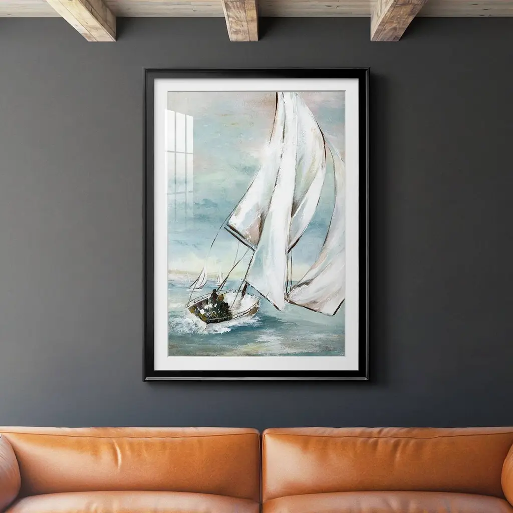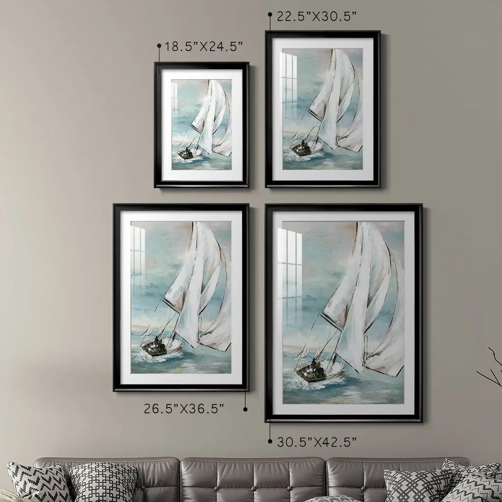 Setting Sail Premium Framed Print - Ready to Hang A Premium Framed Print created to last. Framed in distressed wood and available in an array of sizes and colors Featuring a beveled a solid wood stretcher bar, each piece comes ready to hand 4 SIZES AVAILABLE 30.5''X42.5'' - Overall Size 26.5'X36.5'' - Overall Size 22.5''x30.5'' - Overall Size 18.5''x24.5'' - Overall Size Each piece is made to order. Each piece comes with hanging hardware. Made in the USA Ready to Hang Giclee Paper Print Acrylic Glass Beveled Matt Board