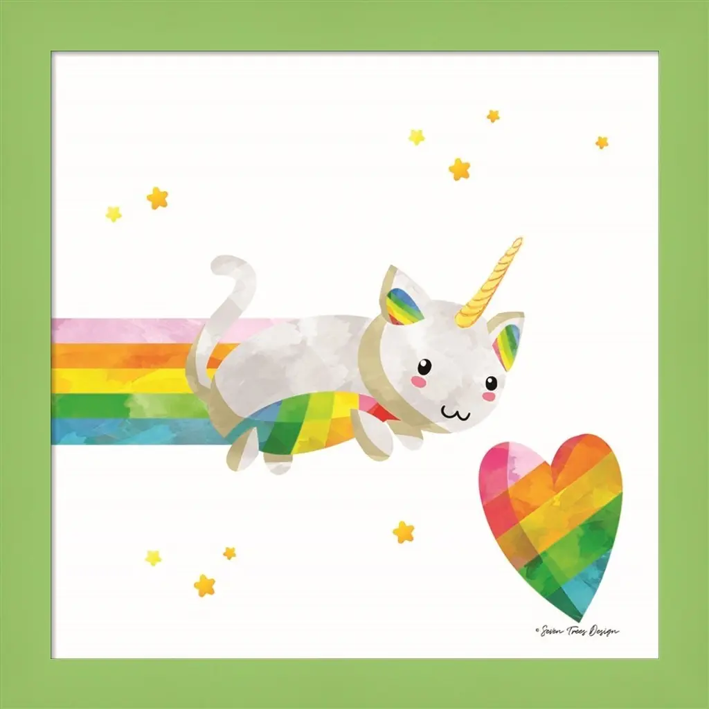 Rainbow Caticorn I by Seven Trees Design is a high quality piece of framed artwork. The finished size of this piece is 14" X 14". It has a Thin Green with Satin Finish frame and is finished with high quality Acrylic Plexiglass. 100% Satisfaction Guaranteed.