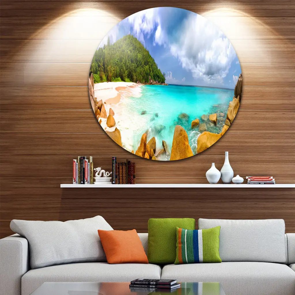 Seychelles Beach Panorama, Seascape Photo Disc Metal Artwork, 23"