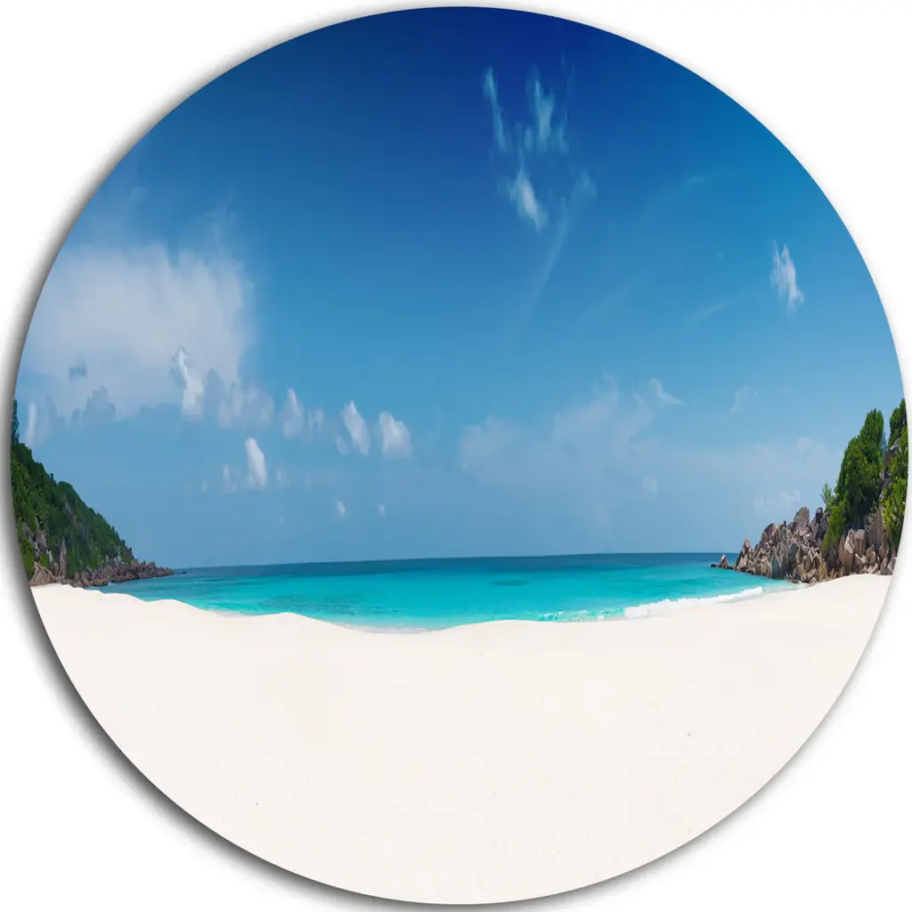 Seychelles Tranquil Tropical Beach, Seascape Disc Metal Artwork, 36"
