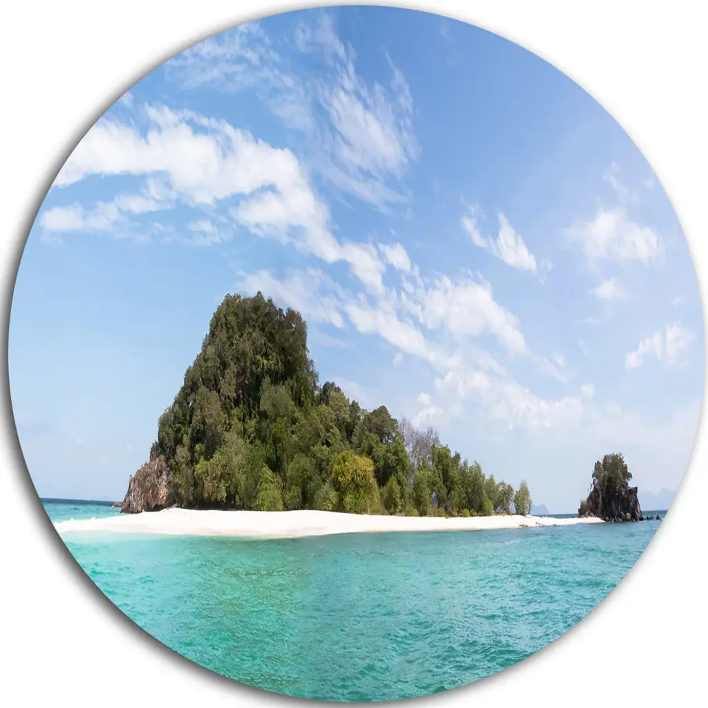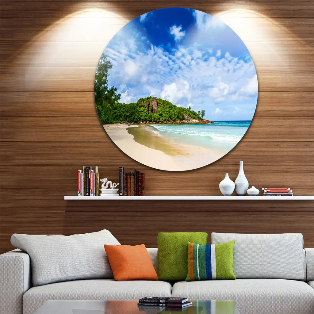 Bring Contemporary Abstraction to your home with this large Circle Metal wall art. This Seychelles Tranquil Tropical Beach Metal Artwork makes it the focal point of any room or office. - White Gloss Coating ensures colors are extra vibrant with light reflection.- Aluminum grade Sheet Metal with 1 inch mounting frame on the back giving the illusion that the artwork is floating on the wall..- Mounting Brackets are included along with instructions.- High Quality Digital images are created directly into a glossy aluminum panel producing a stunning and captivating print into the glossy finish of the metal.- Water, Fire and Scratch resistant HD Aluminum panels.- Looks better than any photo paper and guaranteed to last at least 20 years- Easy to clean with a microfiber cloth. Colors are far superior to regular Canvas Art. - Easy to Hang