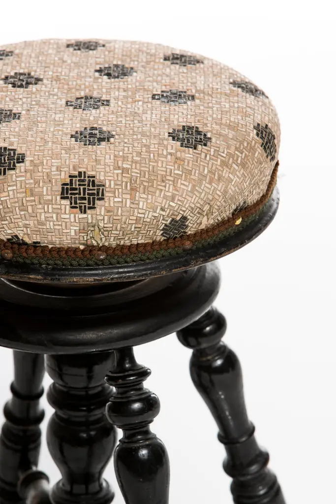 Sgabello Pois Antique wood stool by Yukiko NagaiDimensions: D33 x W33 x H50 cmMaterial: Wood, Marble, Nero, Natural stone, Styrofoam, Glass fiber, Resin, Cement, StuccoWeight: 10 kg All pieces are handmade, so the colours and shapes of the patterns may vary. The chair used in this piece is a one-off antique. The price of the artwork may vary depending on the price of the chair.Born in Niigata (Japan) in 1981, she graduated in Environment Design at the Tama Art University.She moved to Italy, to study the mosaic at the Academy of Fine Arts in Ravenna.The concept behind her body of work, is to reproduce with mosaic the textures of different kinds of material.Through the use of mosaic, she re-enacts the appearance and volume of wood or fabric, briefly deceiving the viewer's eye which, once touched the work, realizes it’s not what it seemed to be. This creates a particular kind of “imbalance” between what the viewers feel and what they see, creating surprise and amusement — the latter being a very important element, that must be present in the work.