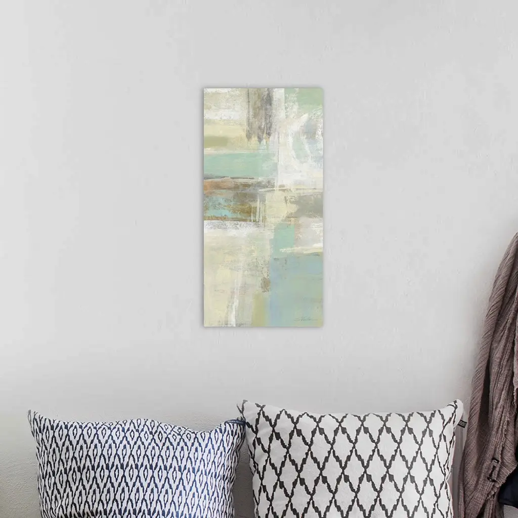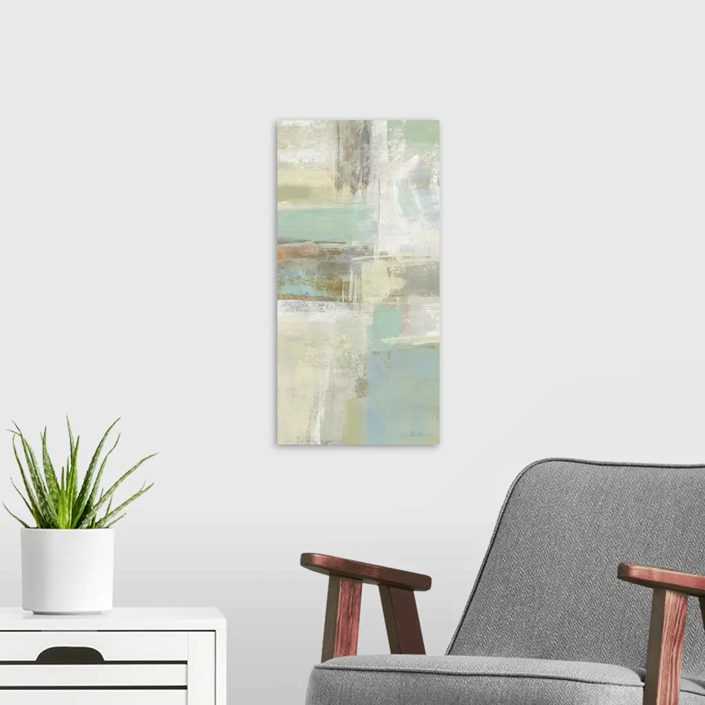 Vertical abstract painting of brush strokes in textured tones of blue, green and white.