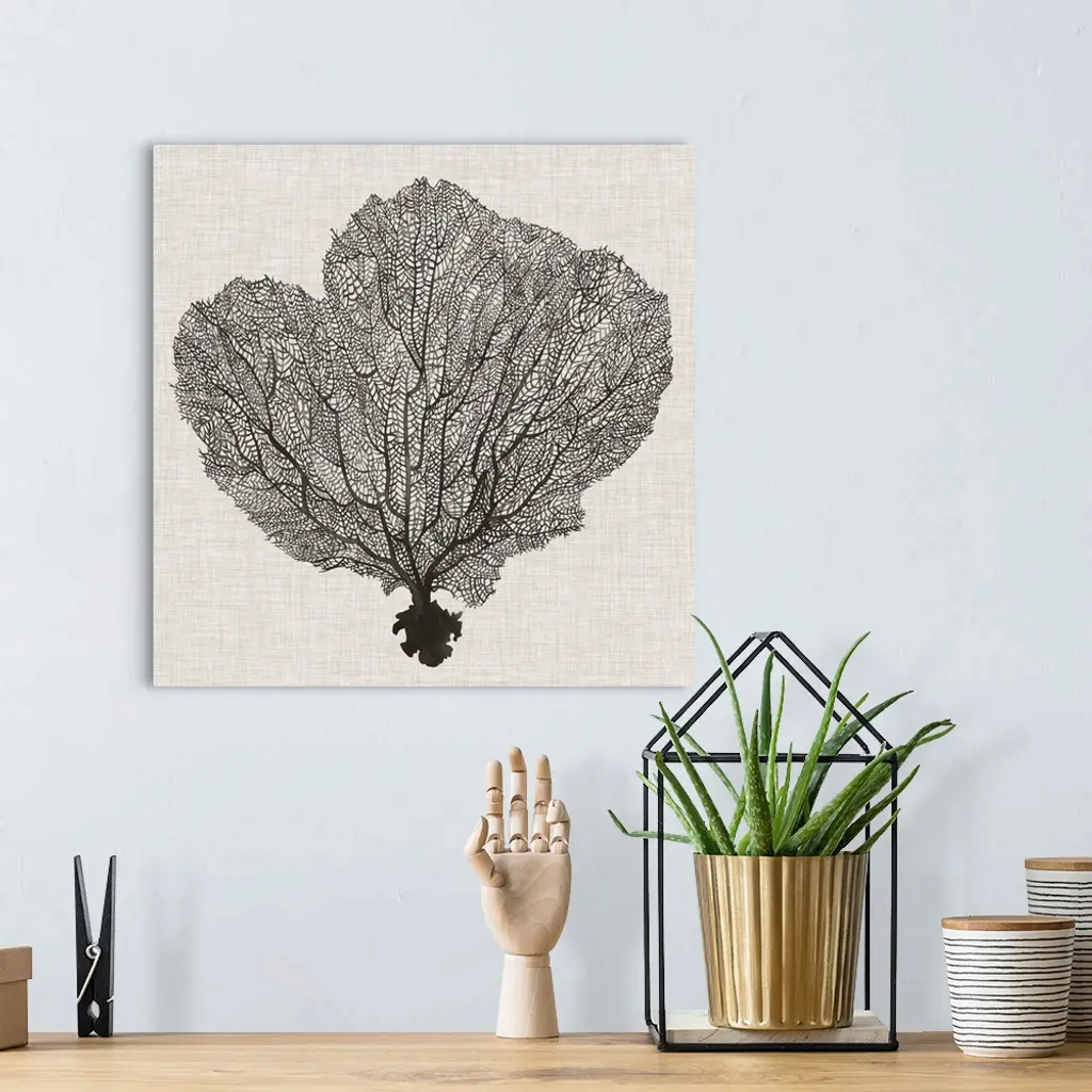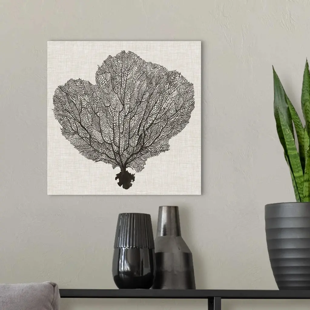 Contemporary decor artwork of a coral sea fan in black against a textured background.