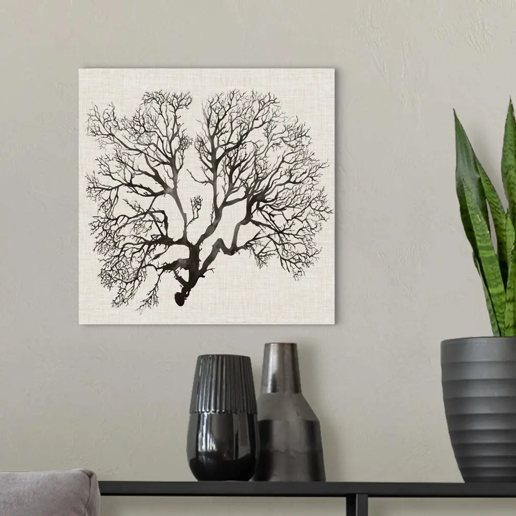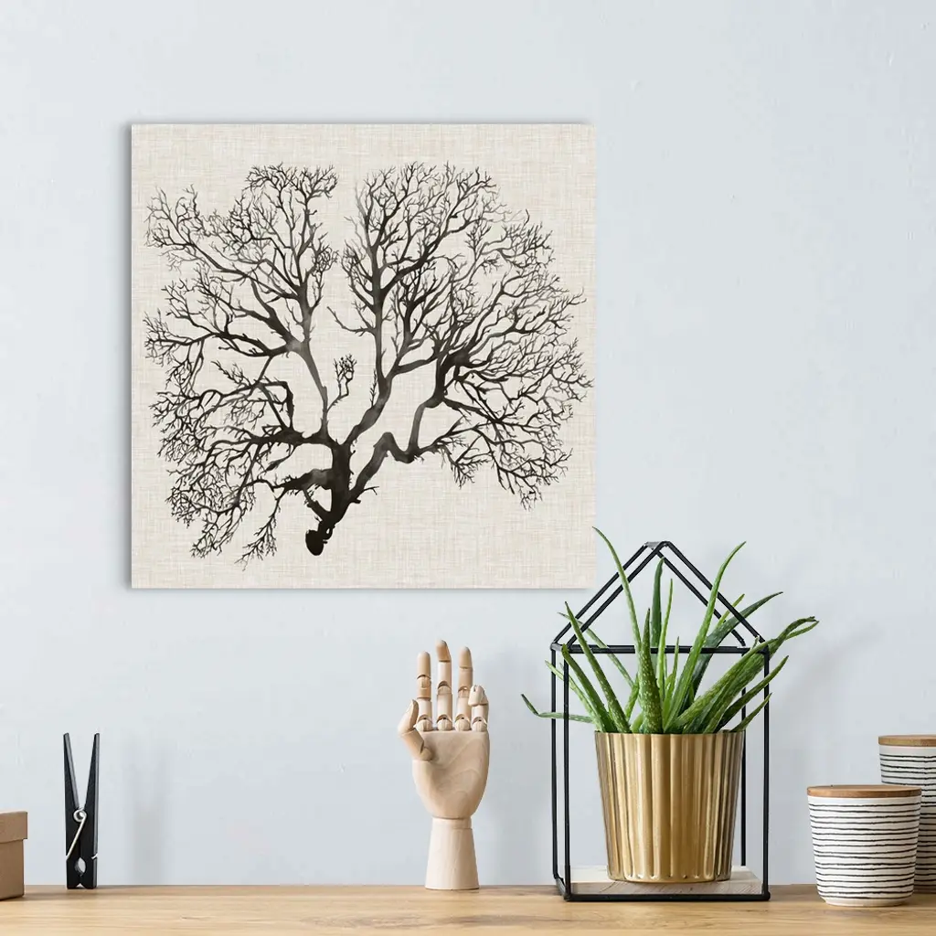 Contemporary decor artwork of a coral sea fan in black against a textured background.