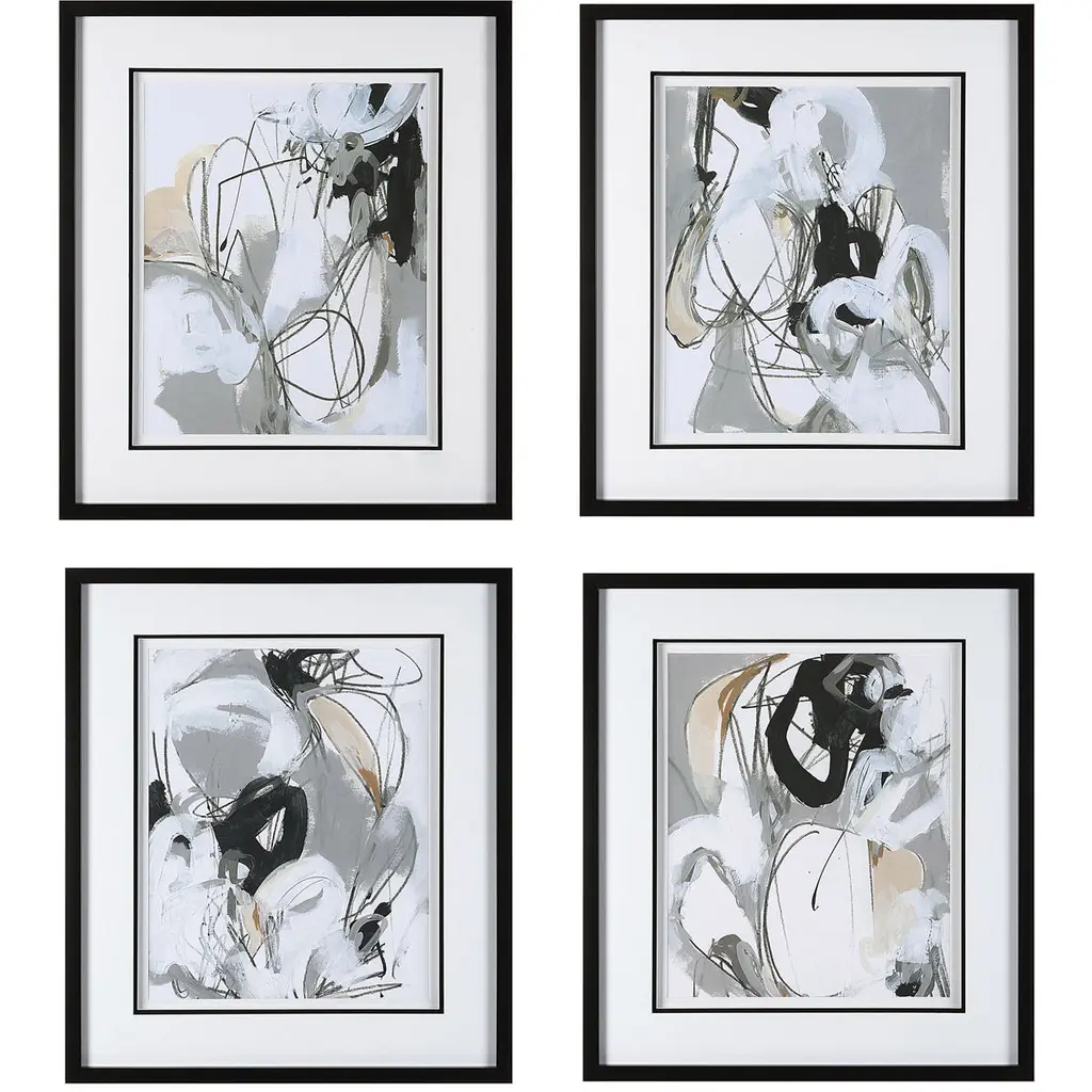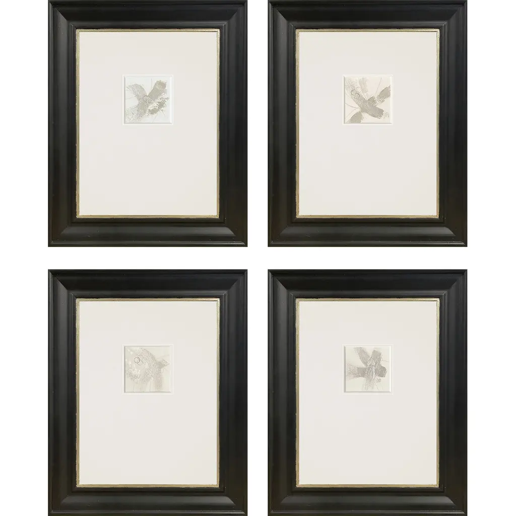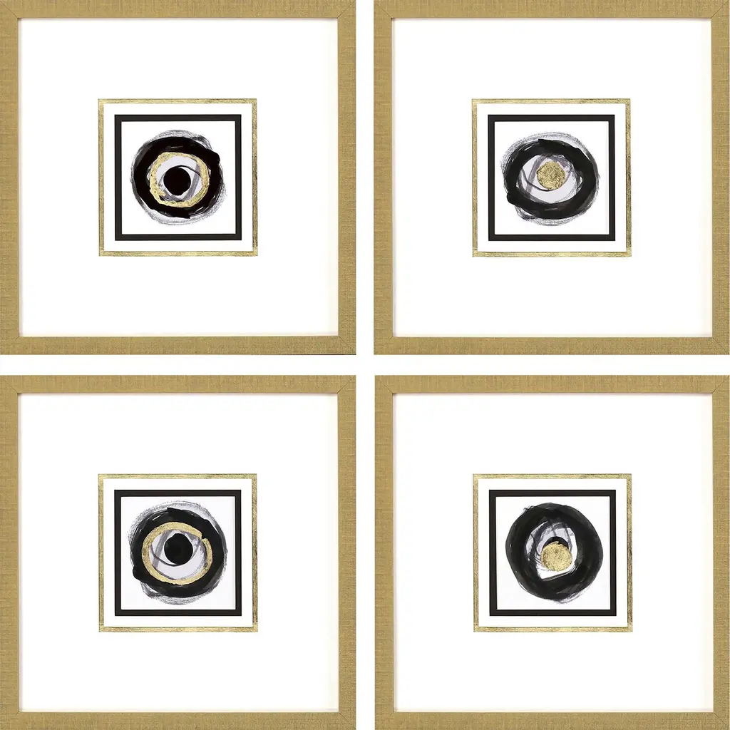 Shadow is a stunning set of four giclee prints on watercolor paper, featuring wispy black tones and a wealth of textural depth. The artwork showcases an opulent gold trim, matched by a gold gallery frame in a smooth finish.