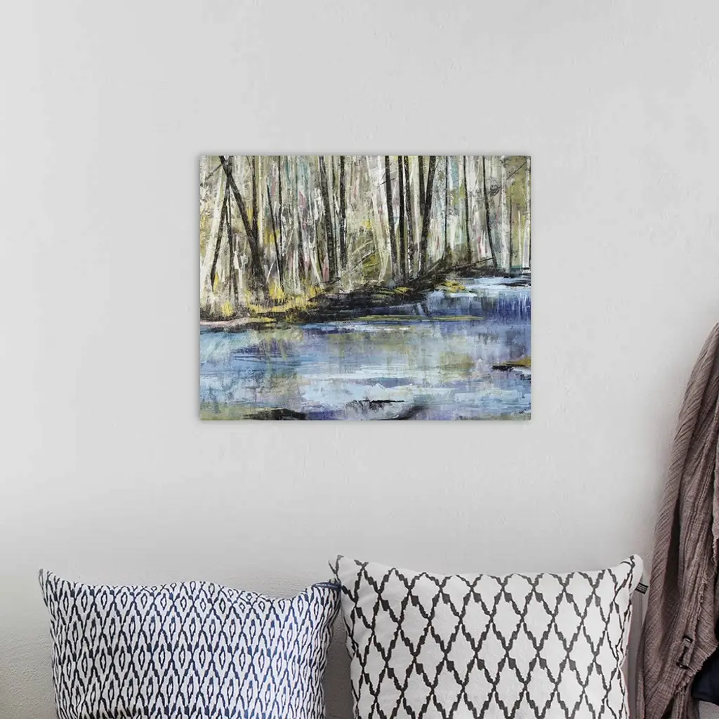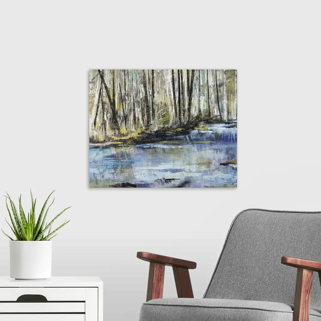 Horizontal painting of a river flowing through a forest.