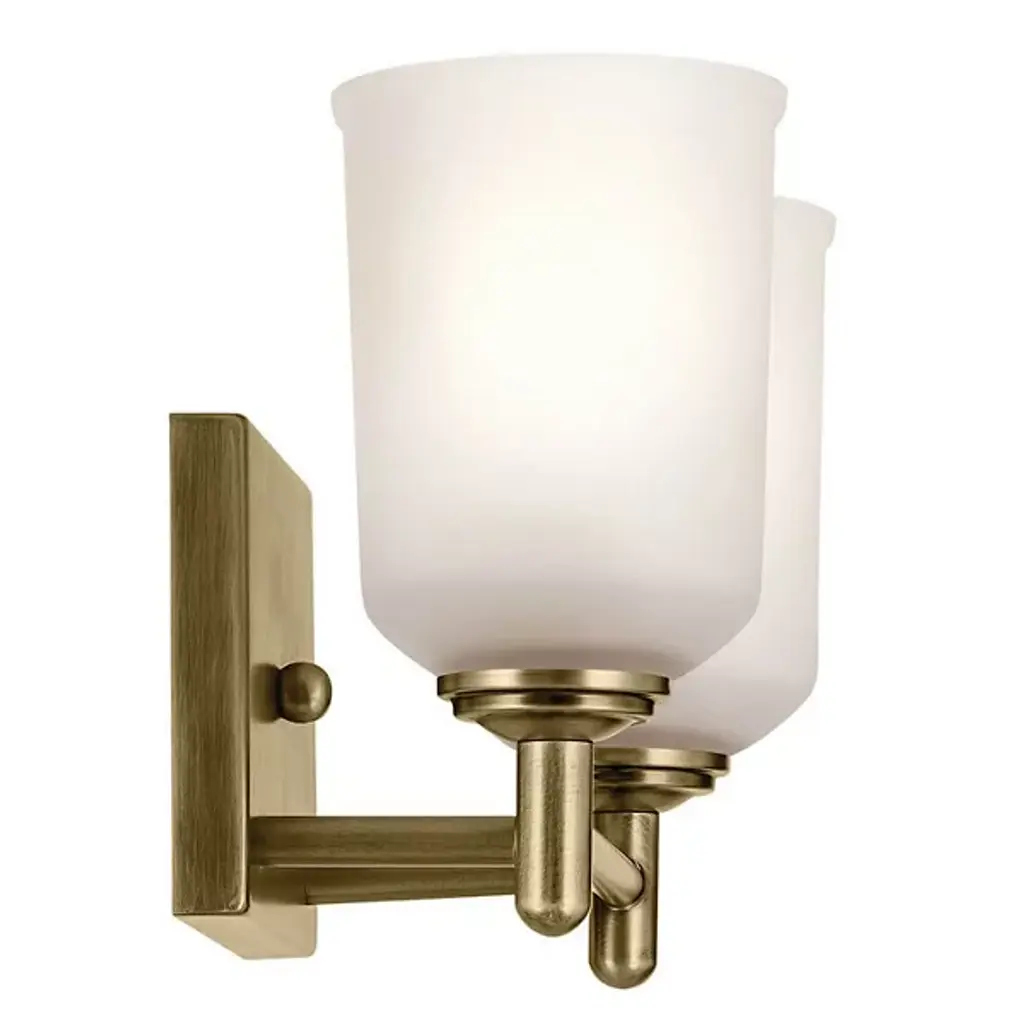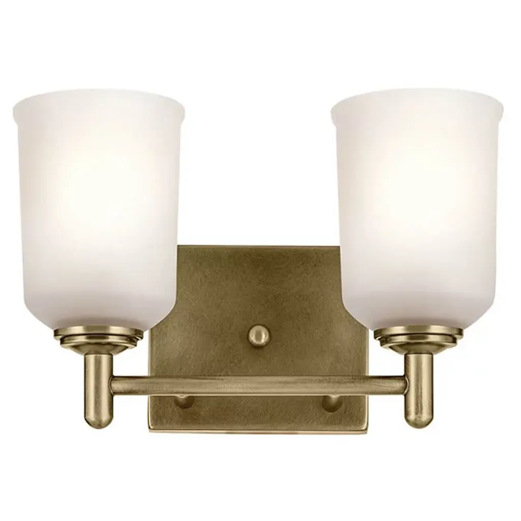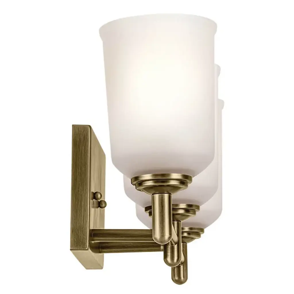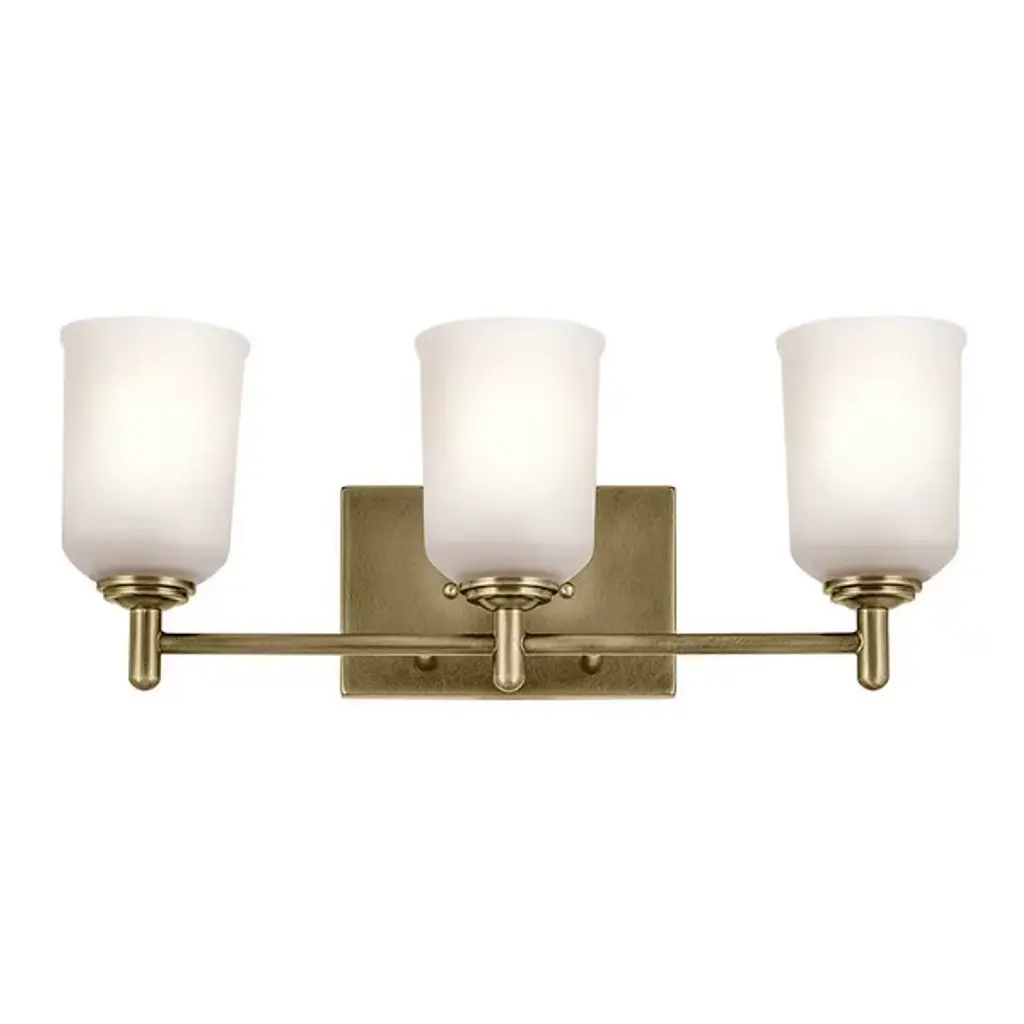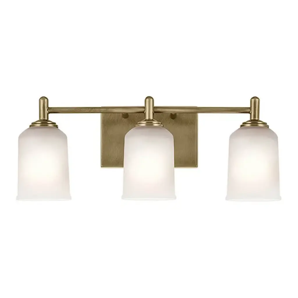 A step up in sophistication. The Shailene Vanity Light from Kichler is a transitional design, elevating the modern and traditional notes of a space. It's a crowning piece atop the bathroom mirror. To complement the aesthetic lines of the room, the bath bar can be mounted with the shades facing up or down. The piece presents a sleek modern character in its metal crossbar. Its satin etched glass shades give off a traditional feel in their simple forms and subtle accenting. When turned on, the bar generates a clean, soft, and spacious glow.