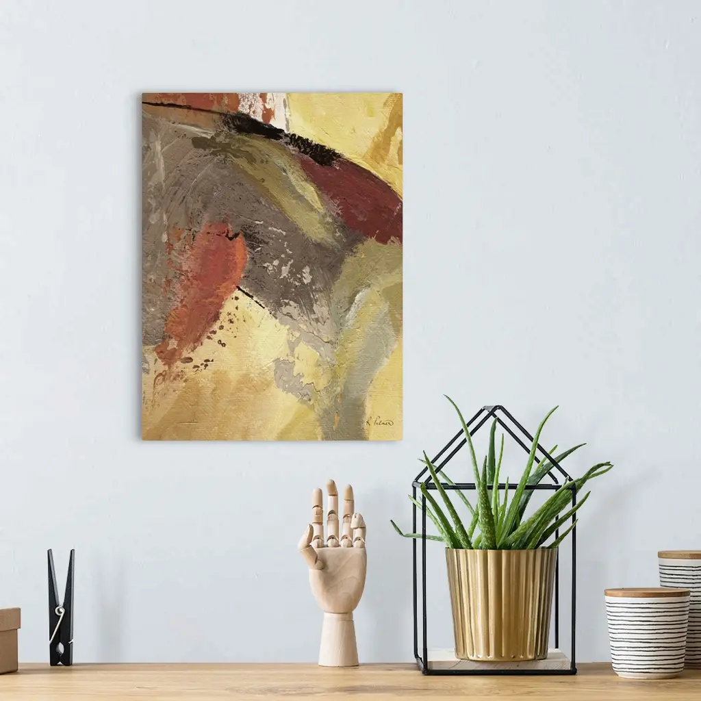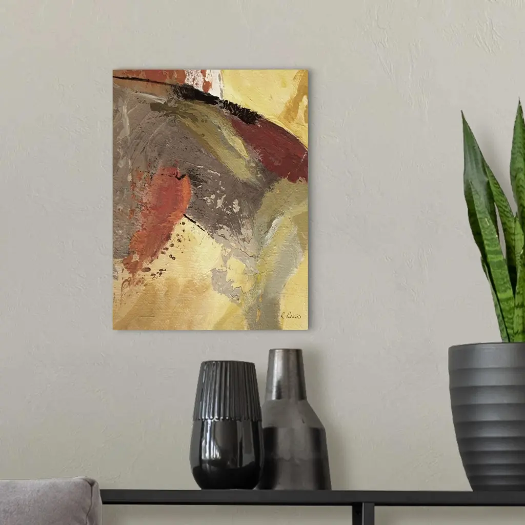 Contemporary abstract artwork with flowing colors in yellow and rusty copper tones.