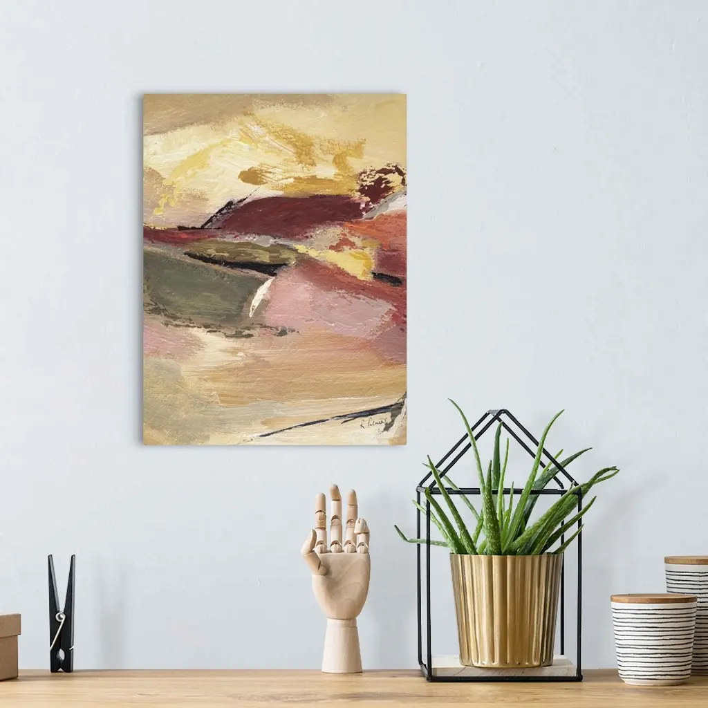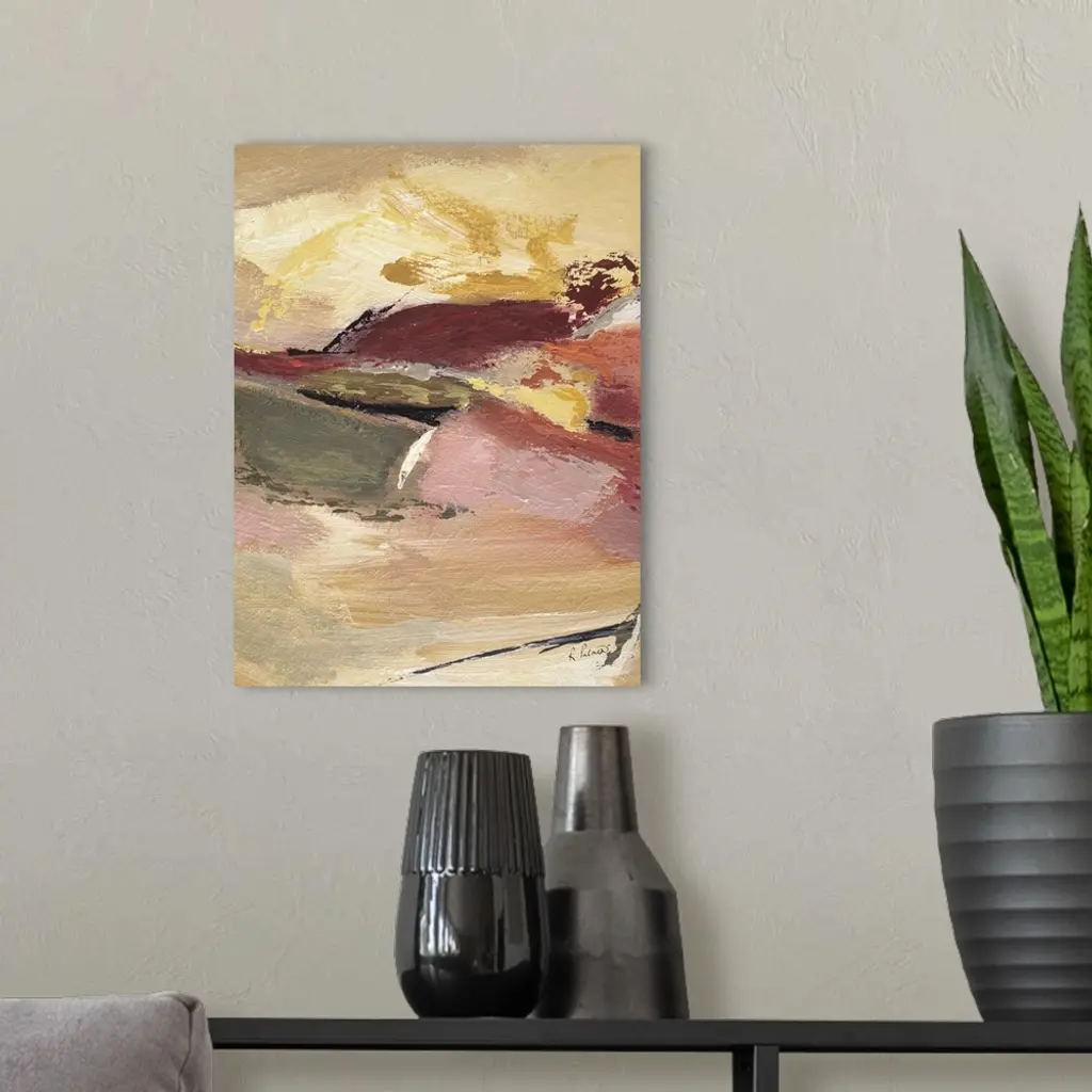 Contemporary abstract artwork with flowing colors in yellow and rusty copper tones.