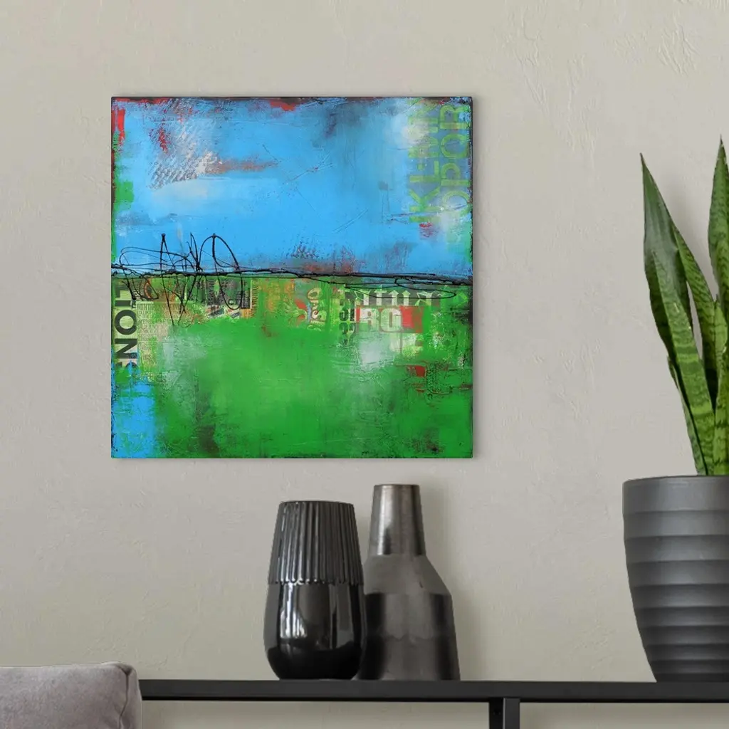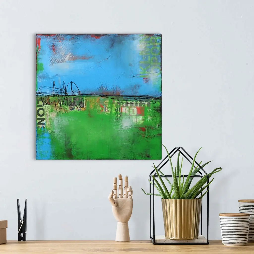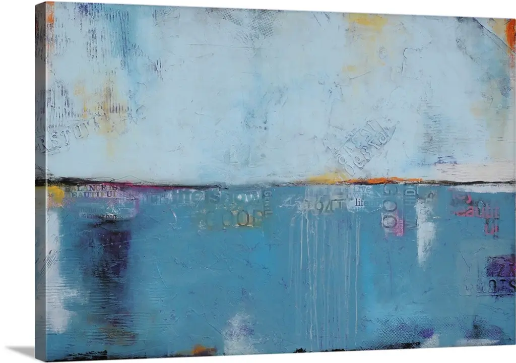 Contemporary abstract artwork compiled using different media. There is text in the background that has been partially painted over with ink scribbles.