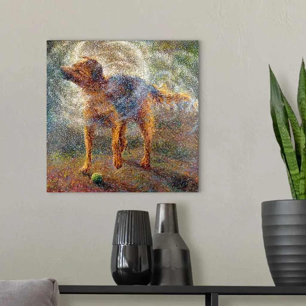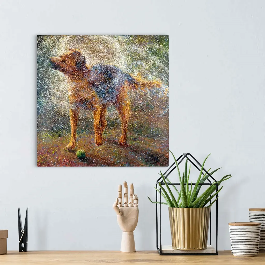 Brightly colored contemporary artwork of a shepherd shaking off water.