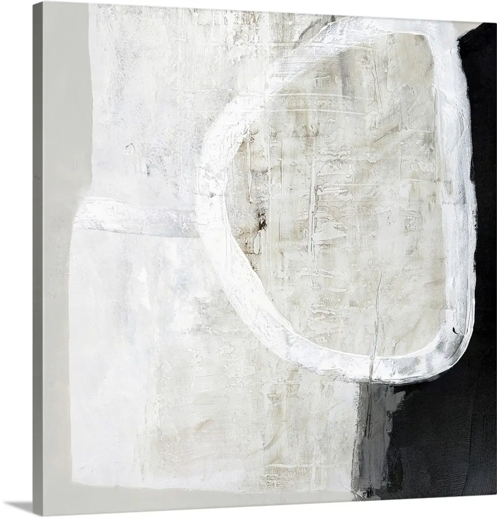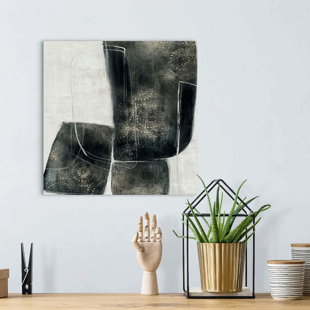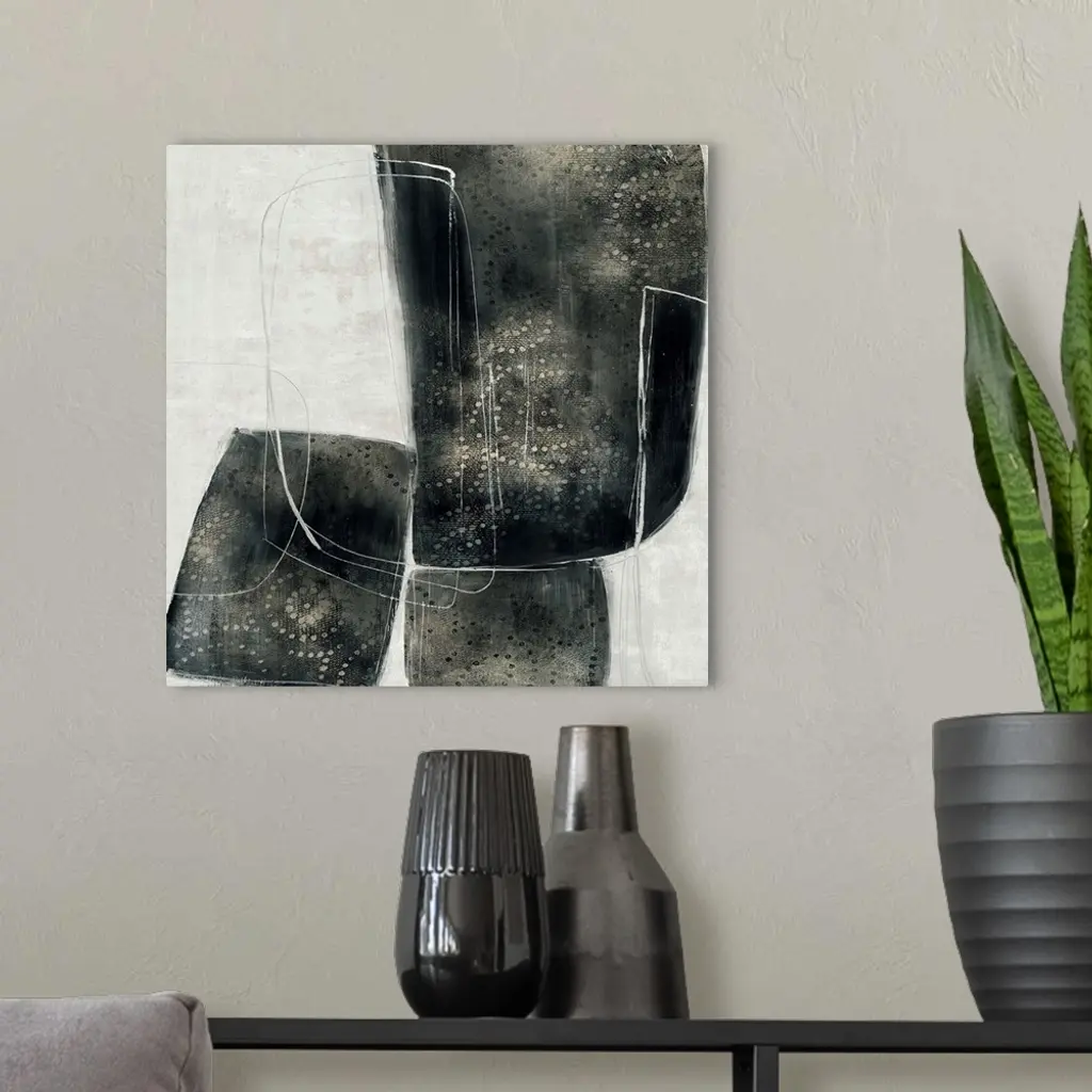 A multi-layered, contemporary, monochrome painting with large organic shapes punctuated by small dots of white on a light grey background