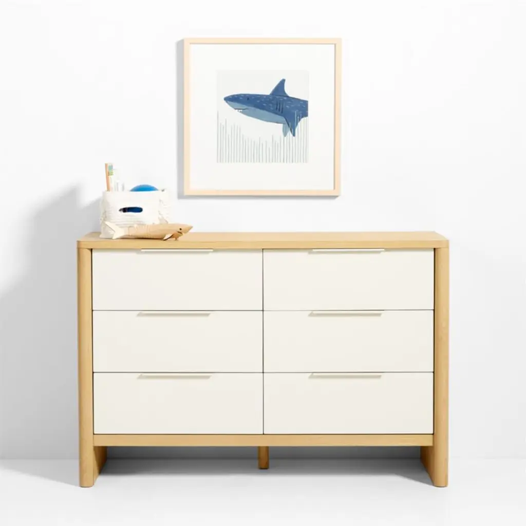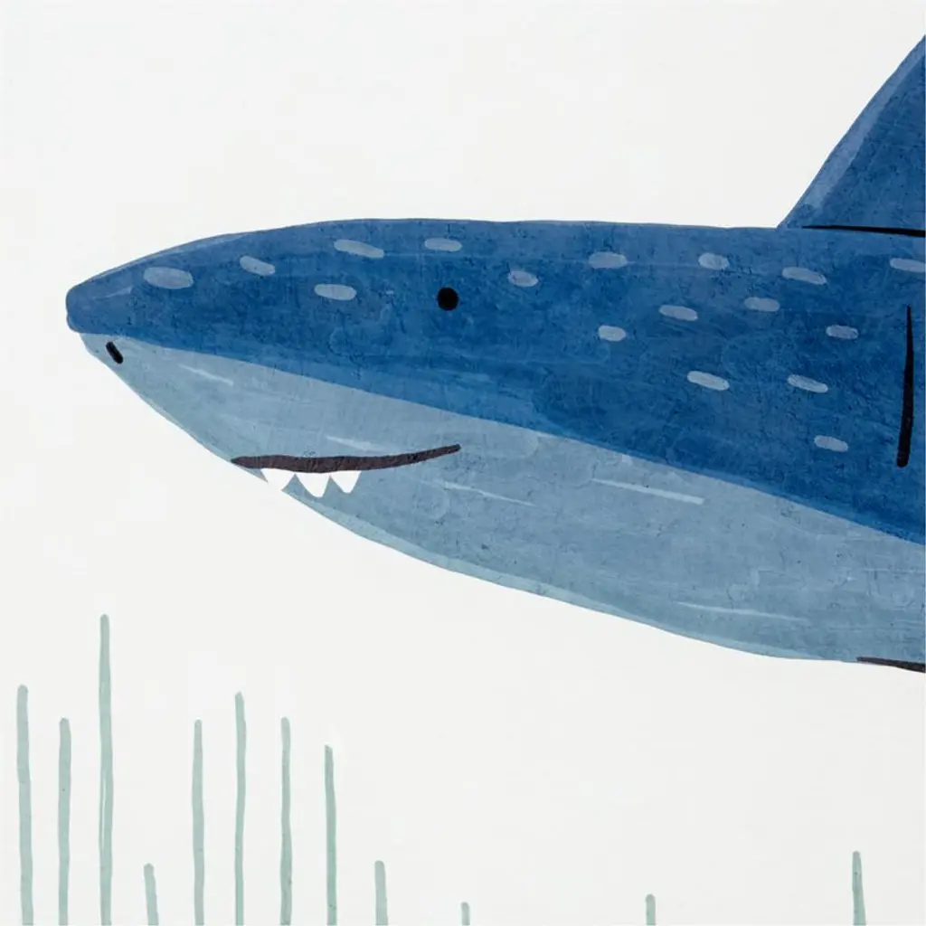 A swimming shark adds colorful, deep-sea style to the nursery, bedroom or playroom. The imperfect stripes add a charming touch to Chicago-based illustrator Betsy Siber's undersea creation, as does the toothy pal's sweet expression. This high-quality giclee print is presented with a white mat and a natural wood frame for a modern look that perks up any space. Display it solo or as part of a curated gallery wall.