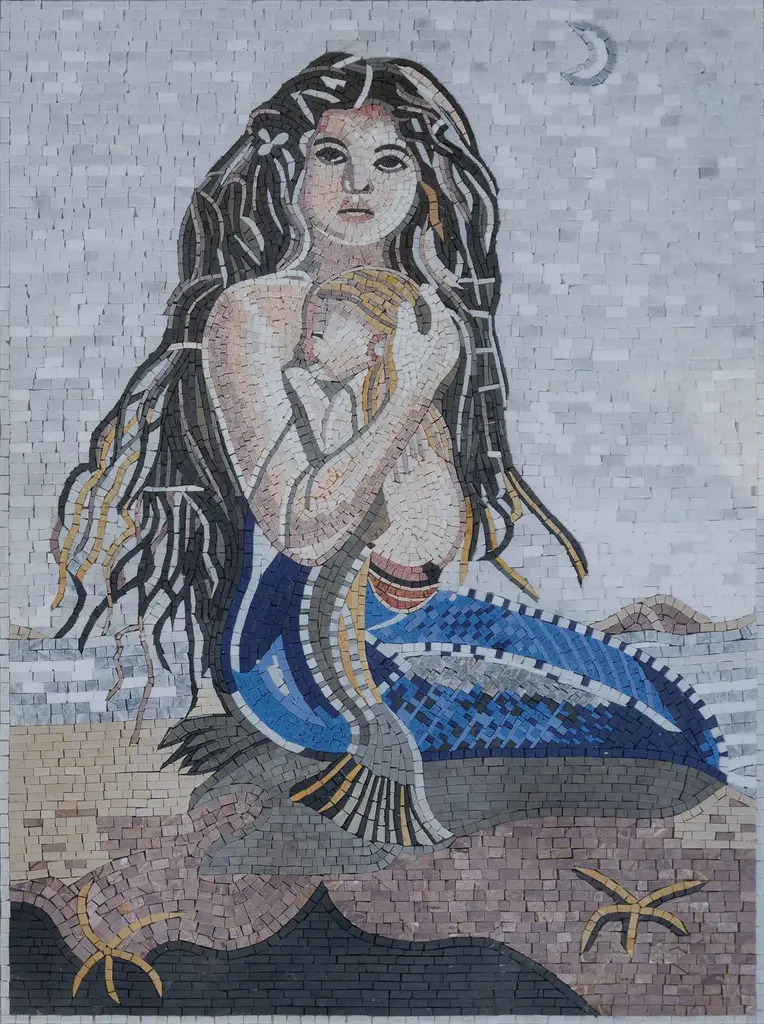 Introducing the Sharon II - Mother Mermaid Mosaic, a stunning handcrafted masterpiece that eloquently captures the essence of a mother’s unconditional love. This exquisite mosaic artwork, the second in the Sharon series, features vibrant blue tones that create a serene and captivating visual experience. Crafted from premium natural marble mosaic stones, each piece is meticulously placed by skilled artisans to form a harmonious and radiant depiction of a mother mermaid, evoking warmth, care, and deep familial connection. This luxurious mosaic is distinguished by its incorporation of rare, jewel-like quartz colors. The luminous Dark Blue Quartz adds a deep cerulean shimmer that radiates with crystalline brilliance, while the prismatic Prisma Blue Quartz delivers a scintillating, translucent radiance that dazzles the eye. Complementing these is the Aqua Blue Quartz, whose shimmering, oceanic brilliance brings a cool, silky touch reminiscent of tropical blue luxury. Together, these exotic materials elevate the mosaic’s visual depth and allure, making it a true statement piece. Versatile and durable, the Sharon II - Mother Mermaid Mosaic enhances any space—whether as a welcoming mosaic art tile backsplash in your bathroom, a charming accent in outdoor settings, or a striking focal point as radiant pool art. Its timeless design and premium quality natural stone ensure it remains a beloved element of your home décor for years to come. Transform your living spaces with the captivating beauty and elegance of the Sharon II - Mother Mermaid Mosaic. Let this handcrafted luxury stone artwork not only complement your décor but also celebrate the enduring bond of family love. Bring artistry and sophistication to your home today with this exquisite mosaic.