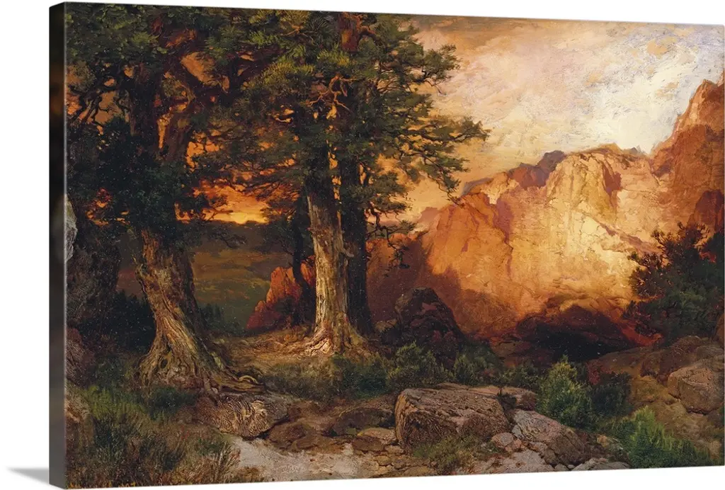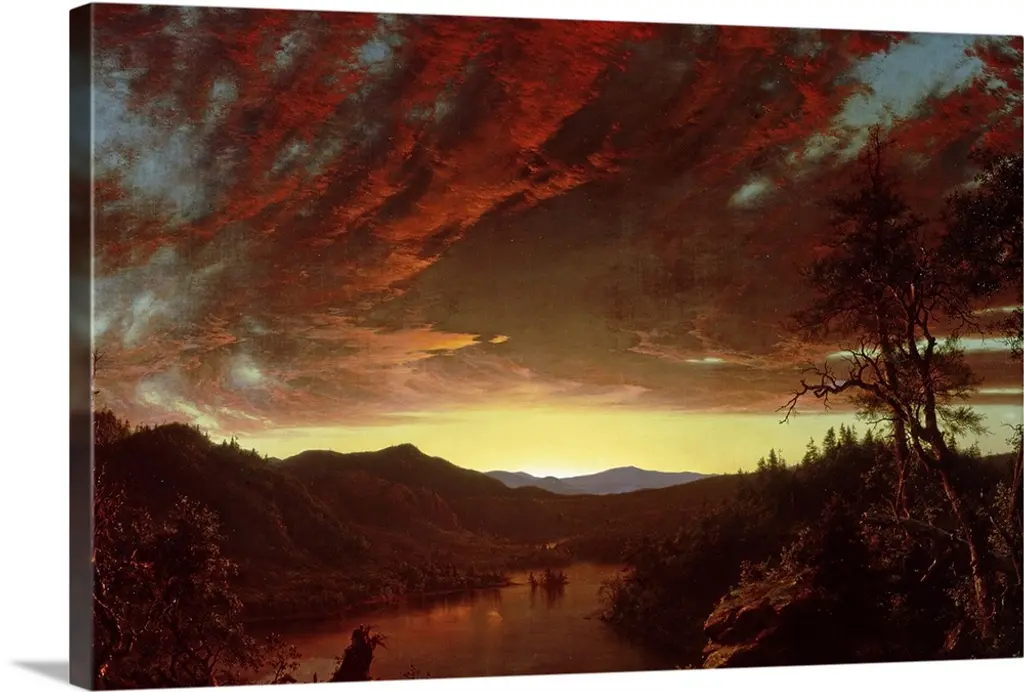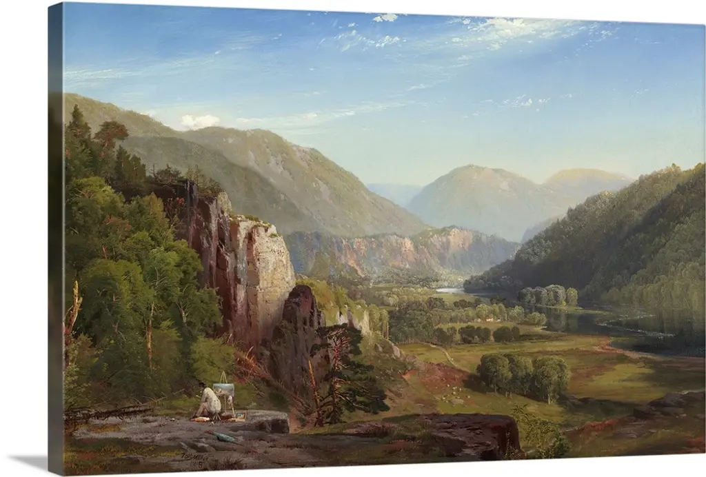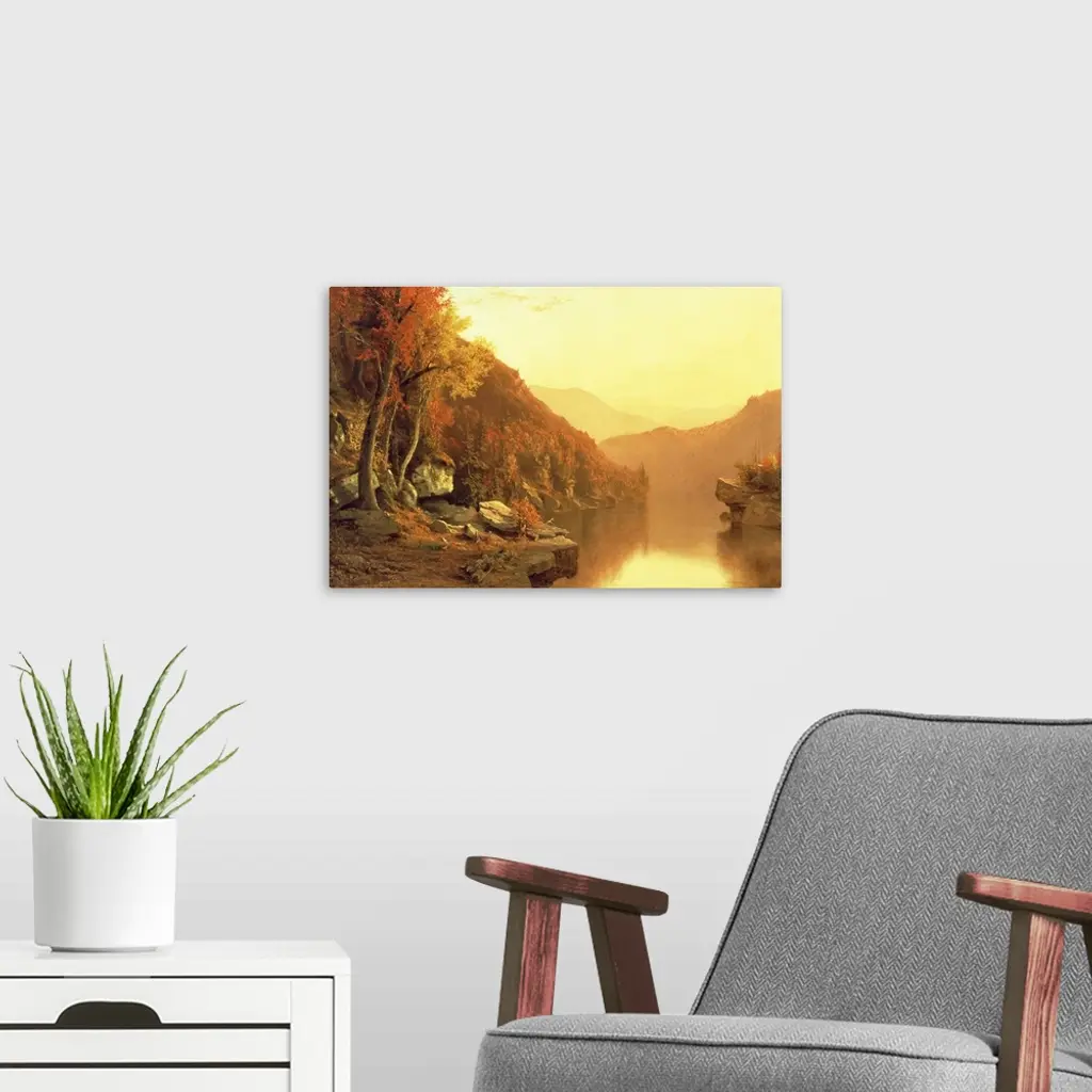 A large oil painting done of mountains during the fall season with a river running through it and trees and rocks lining it.