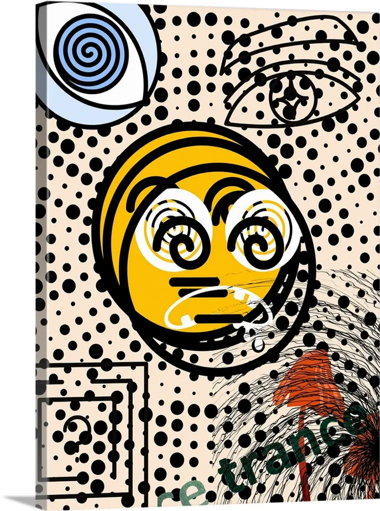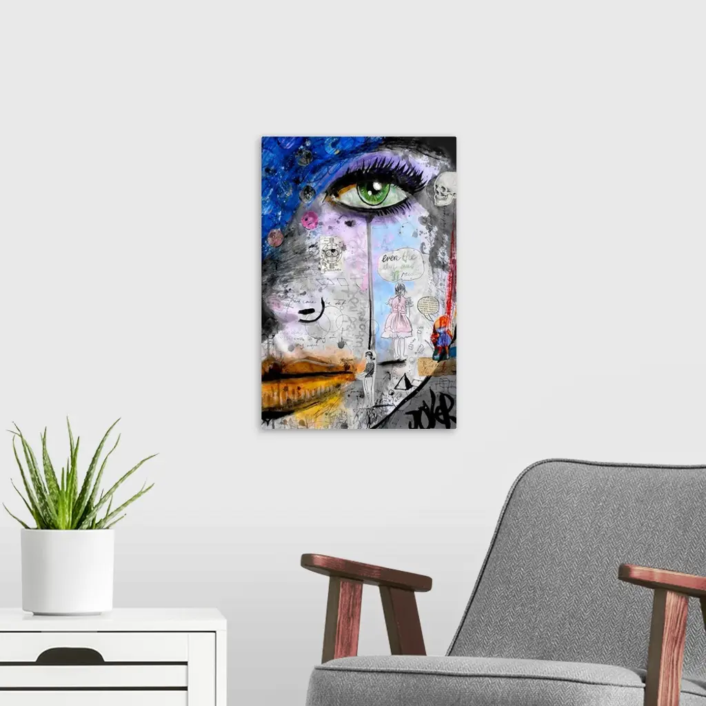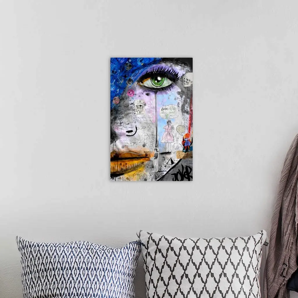 Contemporary urban artwork of a close-up portrait of a woman's face with splashes of vibrant color around her face and a piercing green eye with a tear streaming from it.