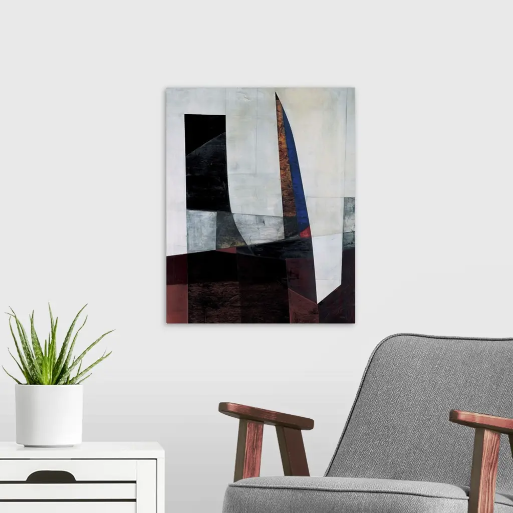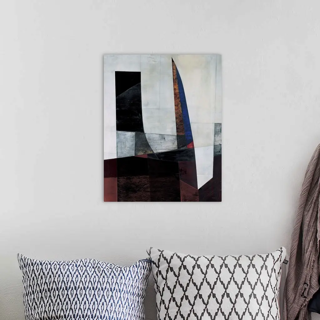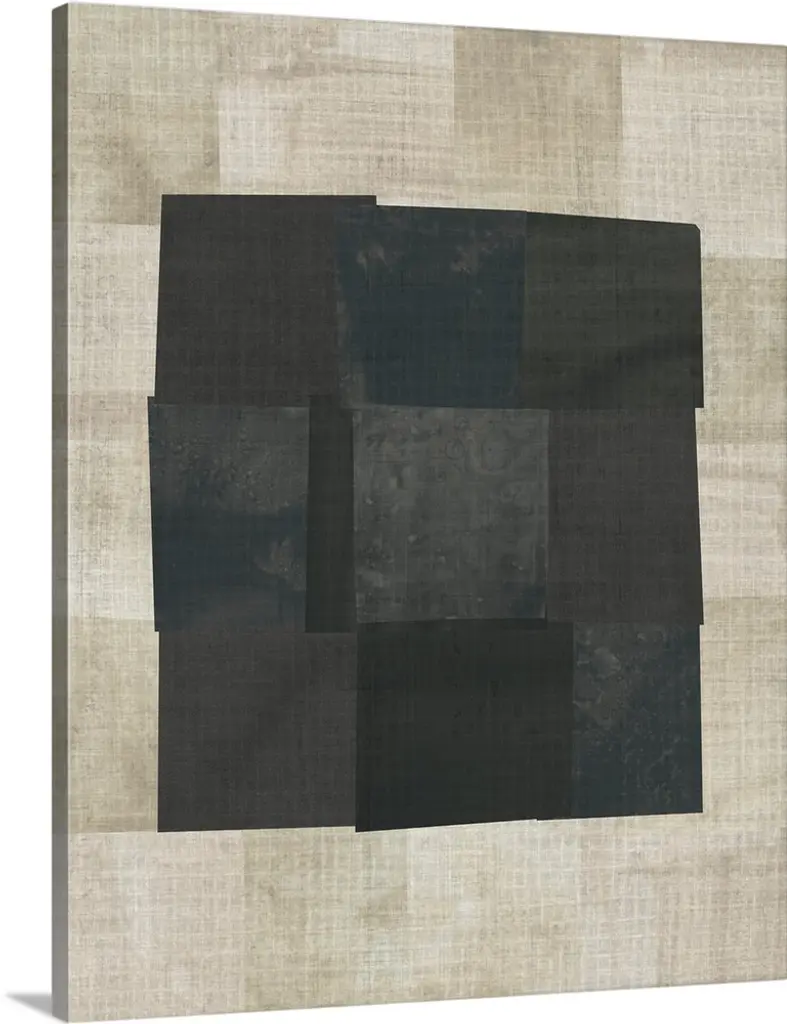 Contemporary abstract painting using dark colors against neutral colors creating a jagged staggered shapes.