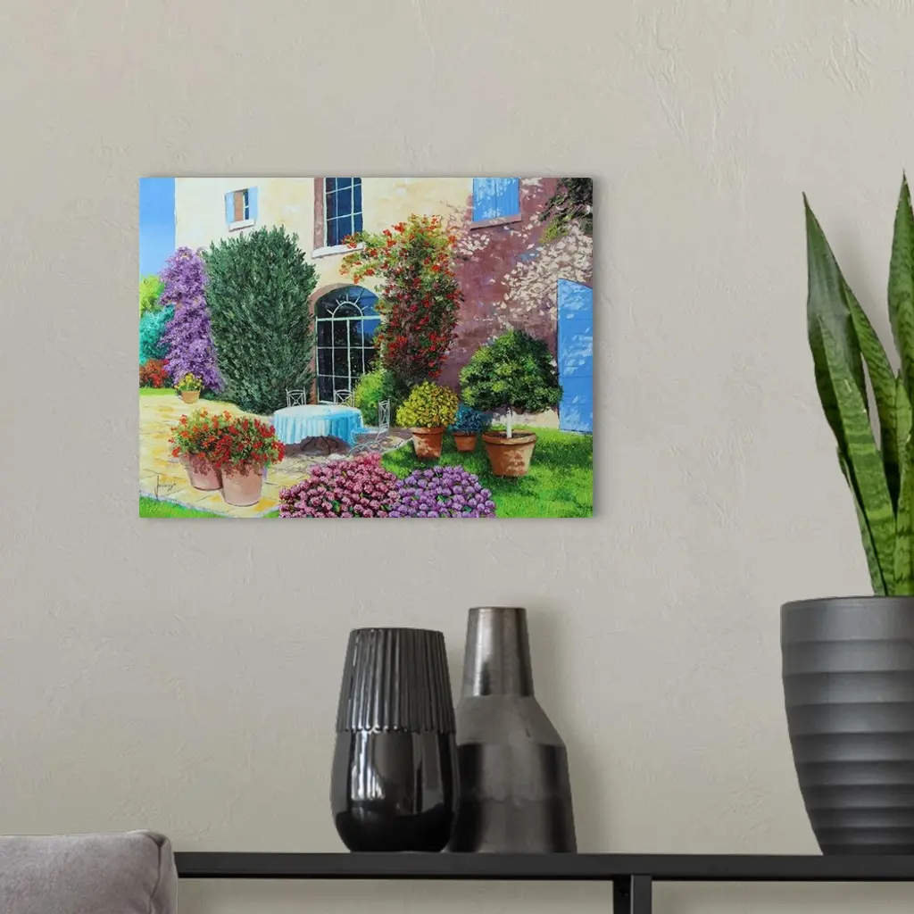 Colorful contemporary painting of a house surrounded blooming flowers and foliage.