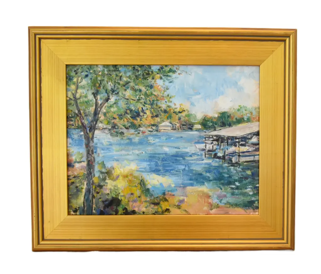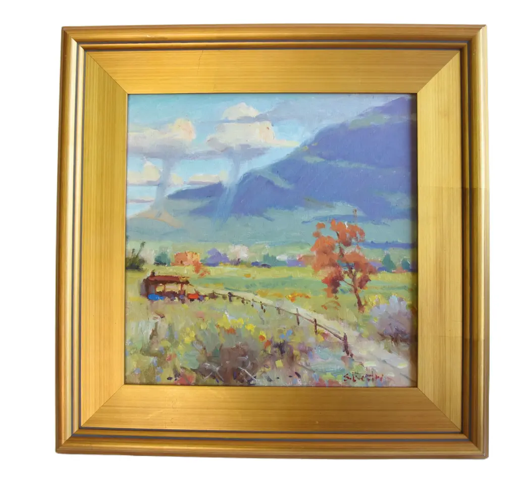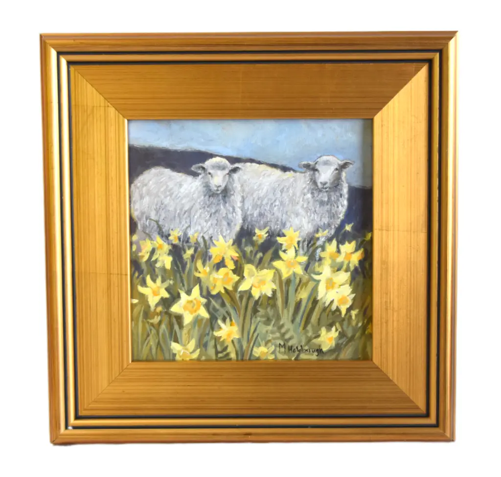 Impressionist grazing sheep oil painting on stretched artist's canvas. It is signed by the artist M. Holobaugh in the lower right. The beautifully antiqued ornate gold wood frame and hanging hardware/wire are included. Dimensions: The artwork measures 8������L x 8���H, and the overall dimensions, including the frame, are 11”L x 11”H. It is available from Mike Seratt of The Prized Pig. It is in excellent, beautiful condition!!!