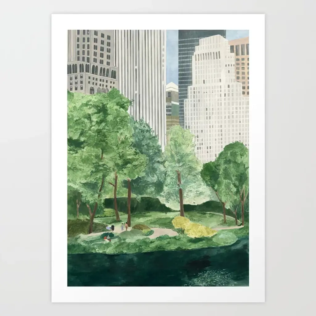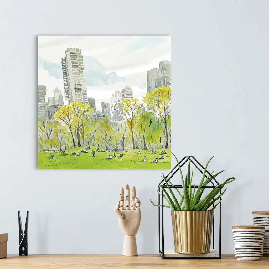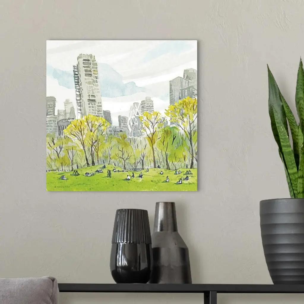 A spring day well spent sitting in the picturesque lawns of Sheep Meadow in Central Park, painting the New Yorkers relaxing in the grass after work. Watercolor captures the trees beginning to leaf and the gray skyscrapers behind.