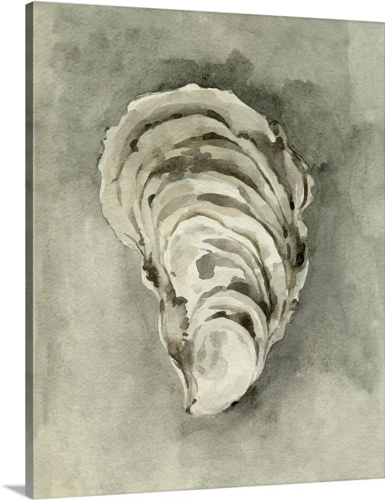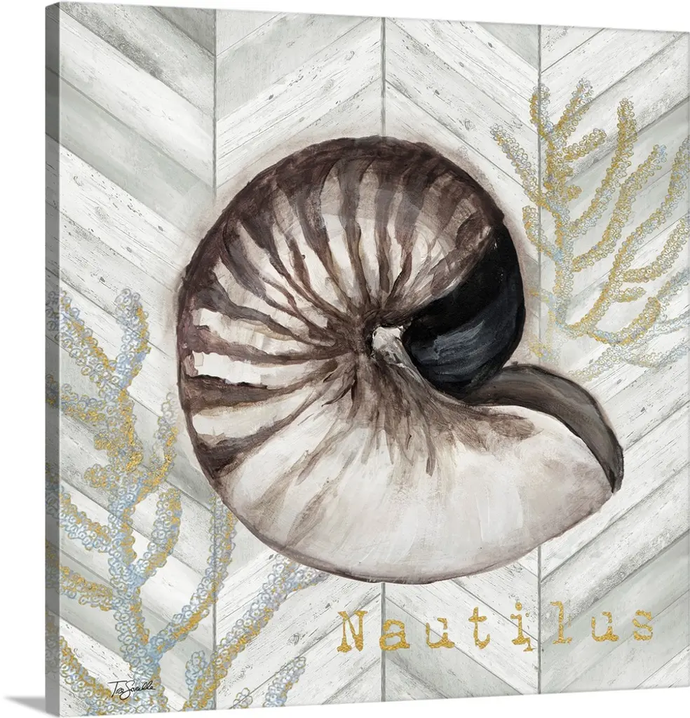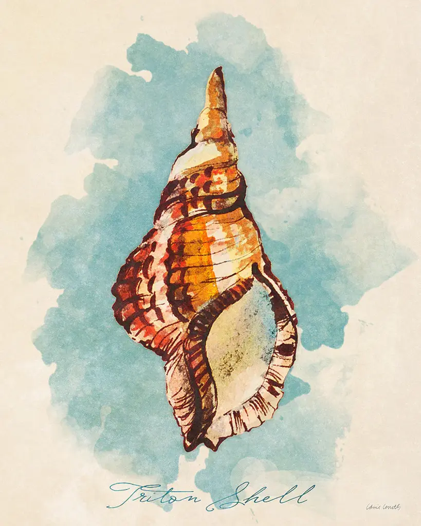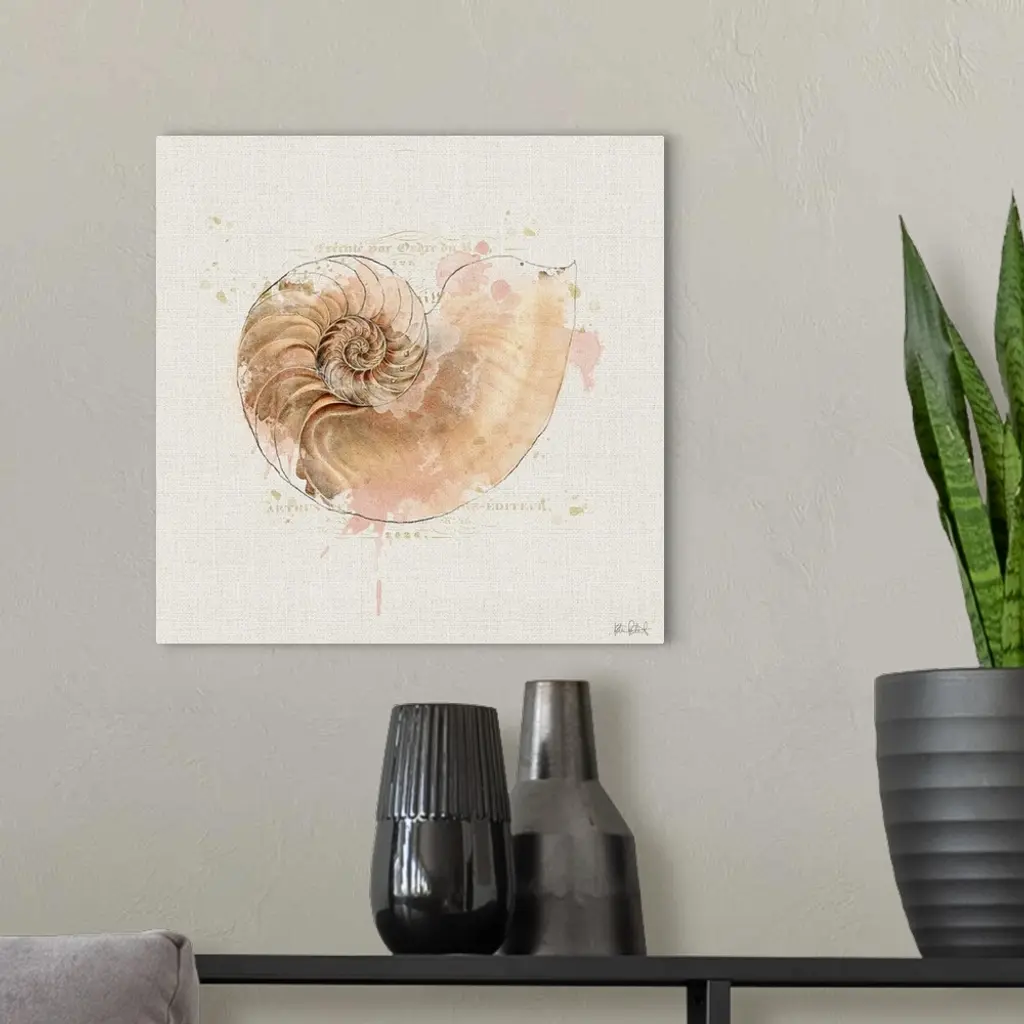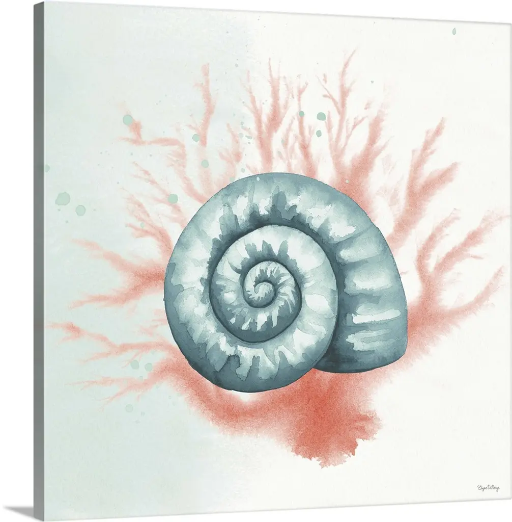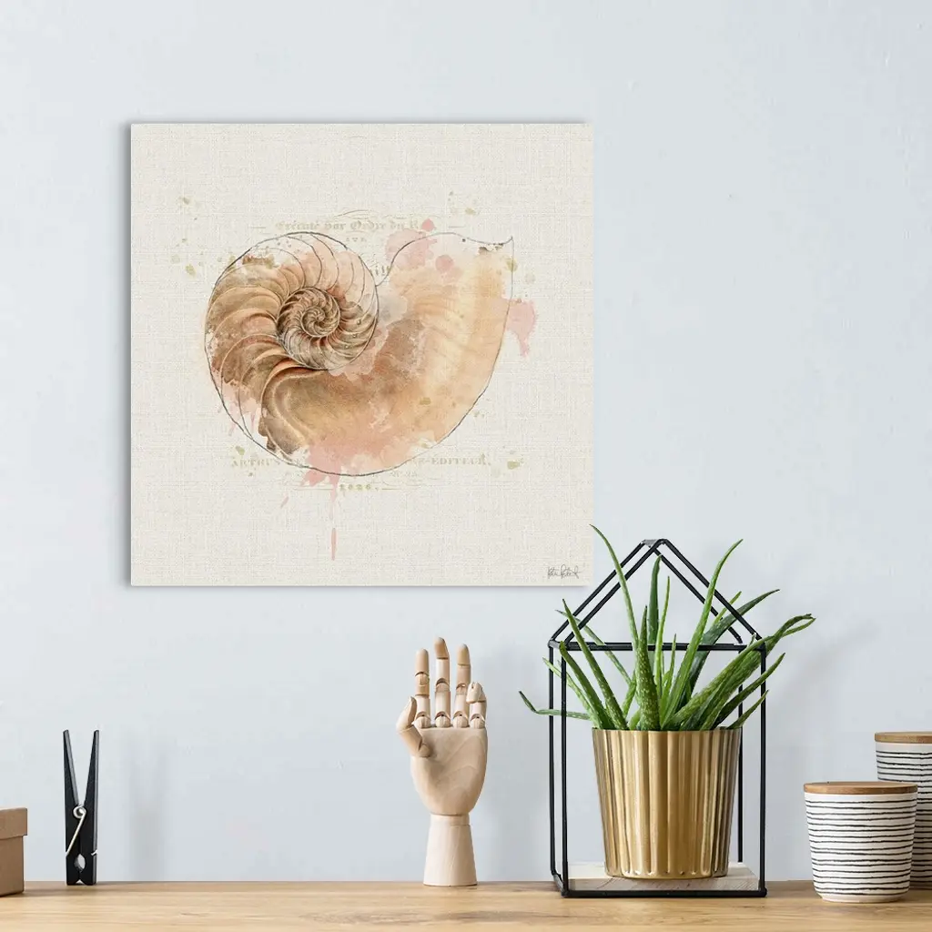 Square watercolor painting of a coral colored seashell with faint gold text in the background.