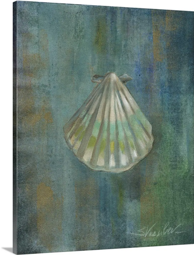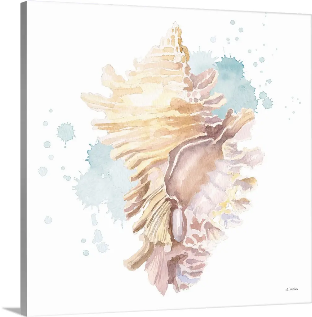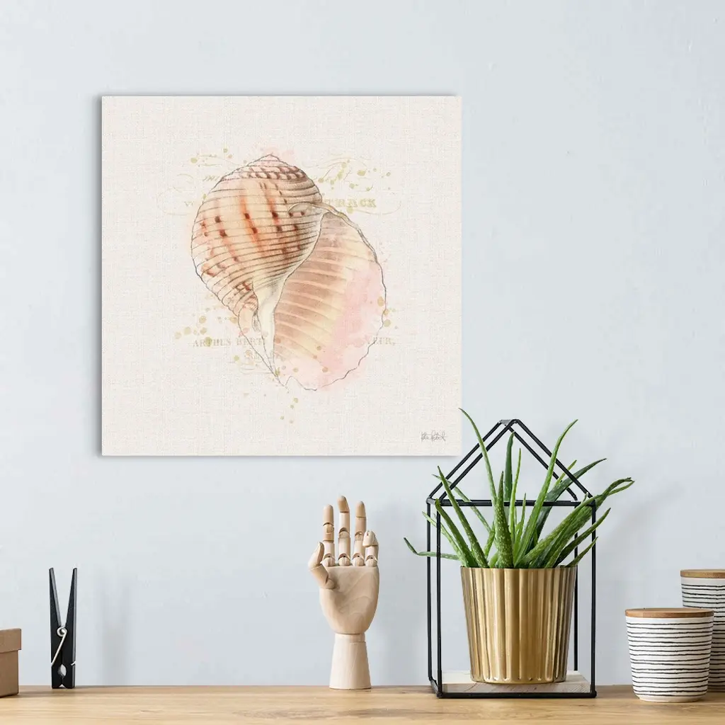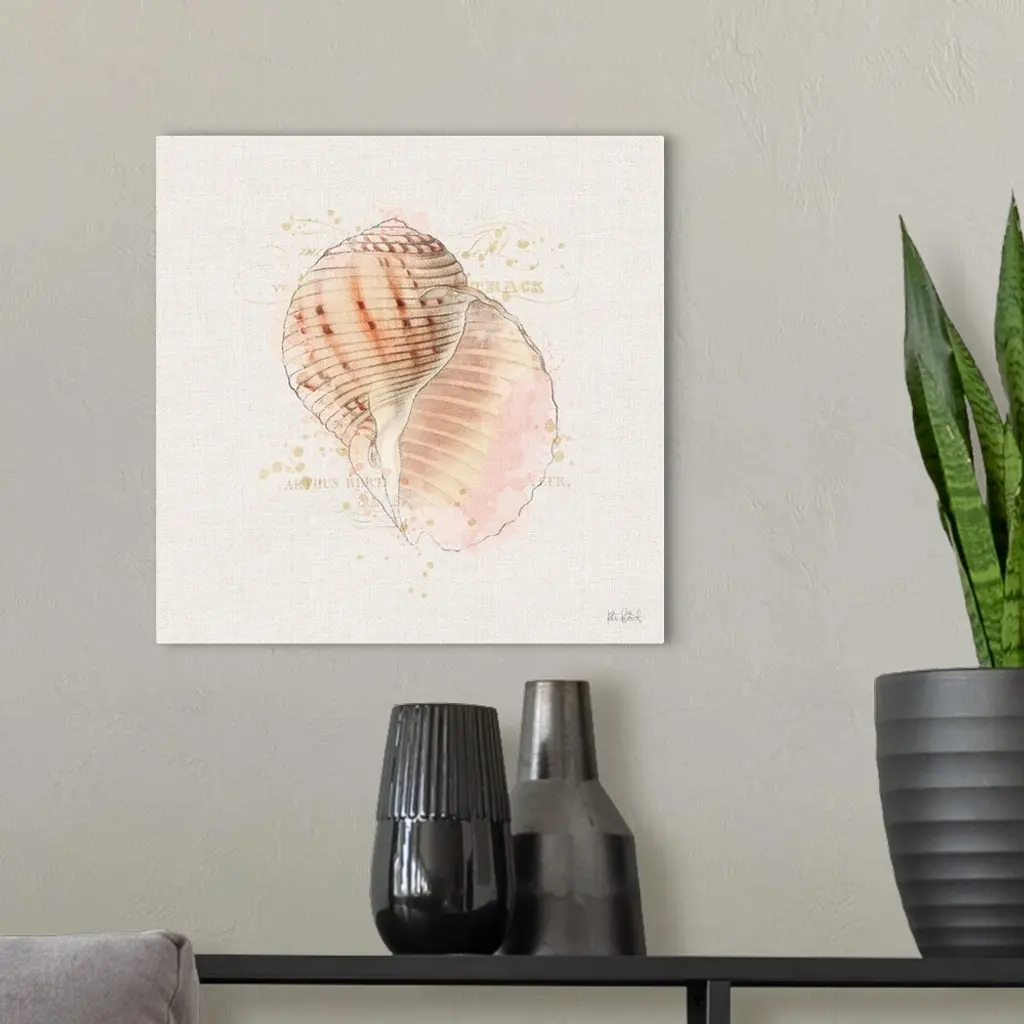 Square watercolor painting of a coral colored seashell with faint gold text in the background.