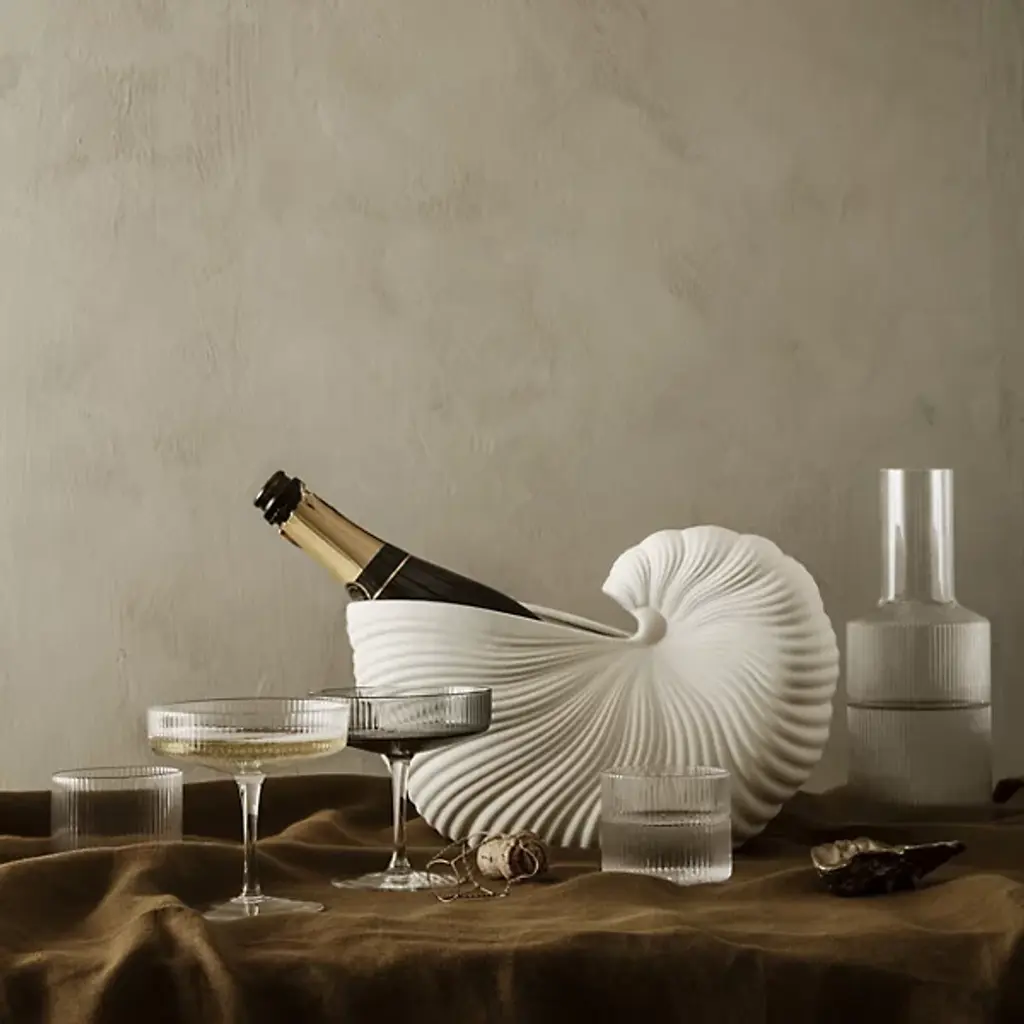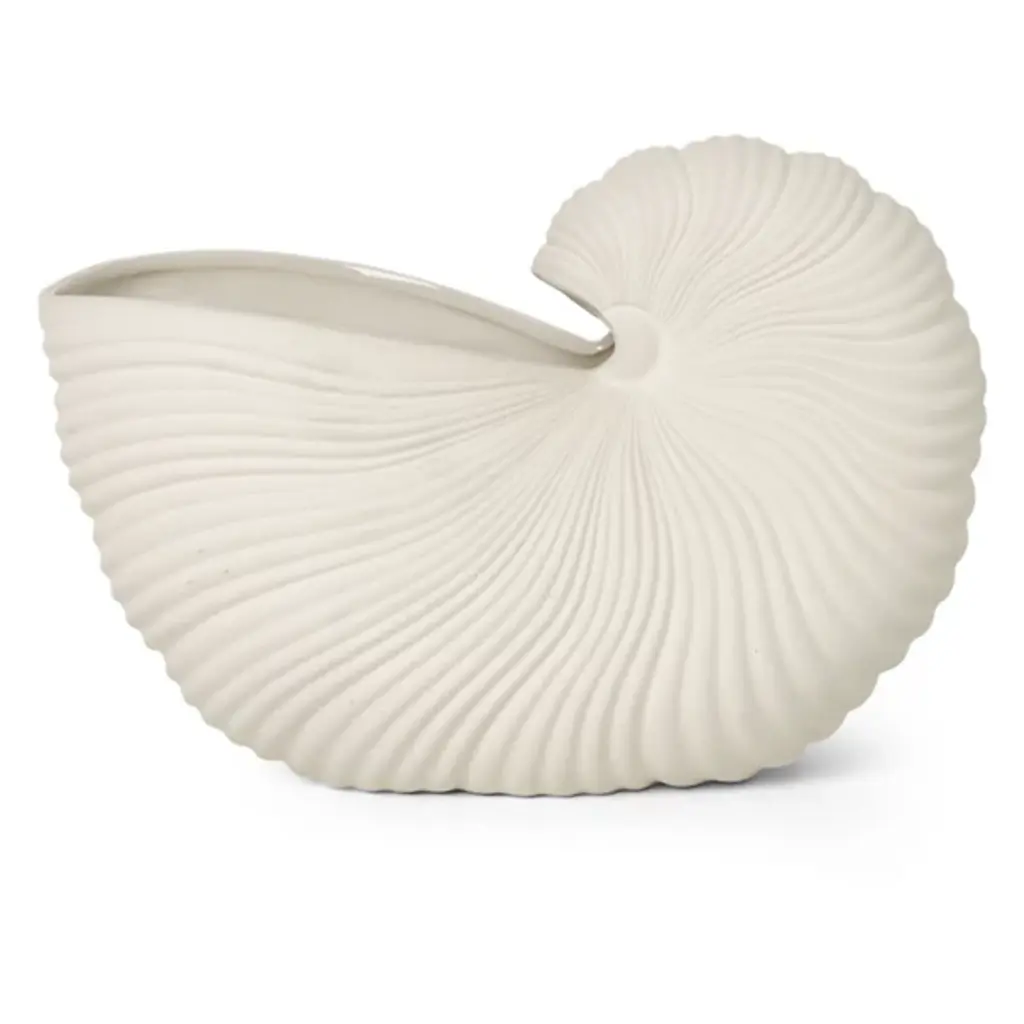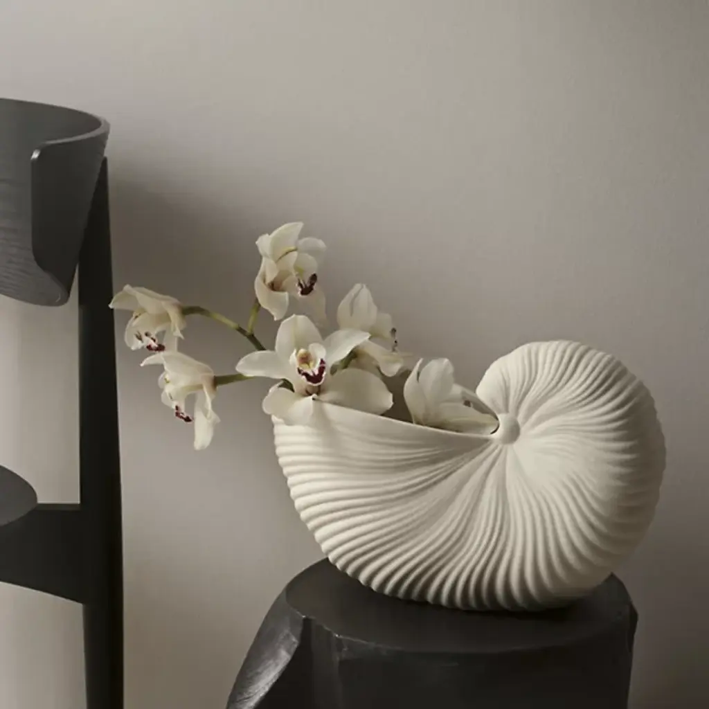 The Shell Pot from Ferm LIVING incorporates natural motifs into modern aesthetics, mirroring the graceful form of a nautilus shell. Its matte exterior and glazed interior offer a harmonious blend of simplicity and sophistication, with small striations adding delicate yet detailed detail to any space. Its contemporary design is softened by natural lines, allowing it to display plants within or stand out as an art piece with the textured, sculptural design.