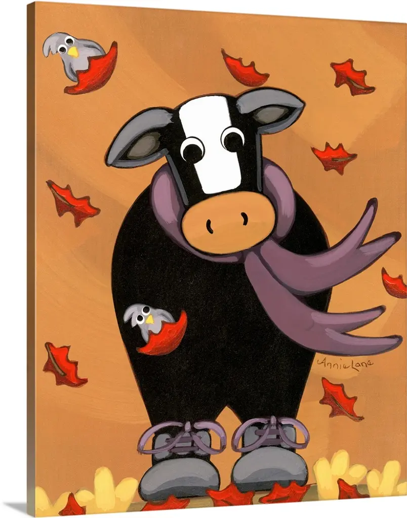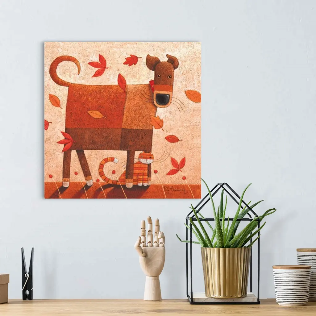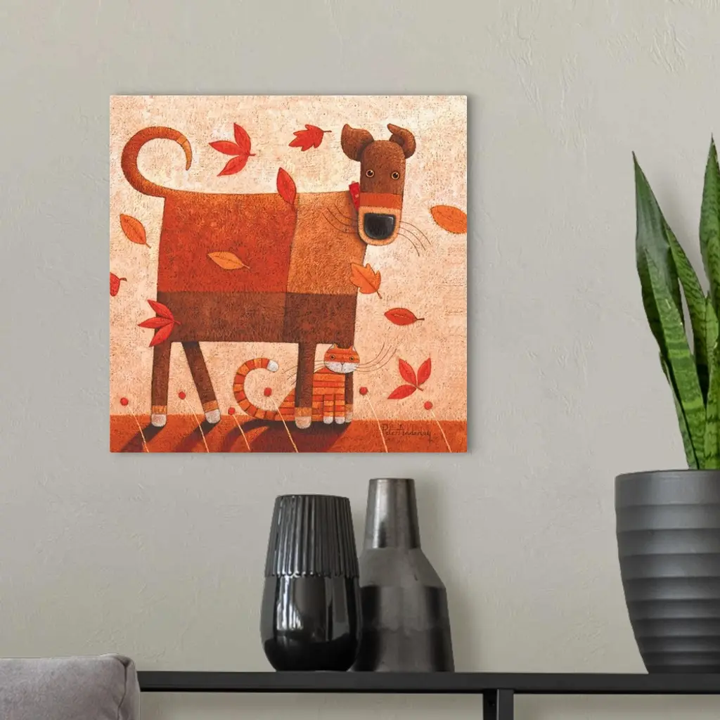 Contemporary painting of a dog and cat sitting being hit with wind and autumn foliage.