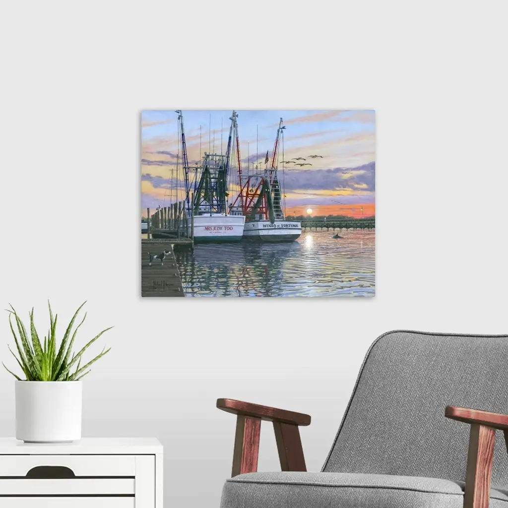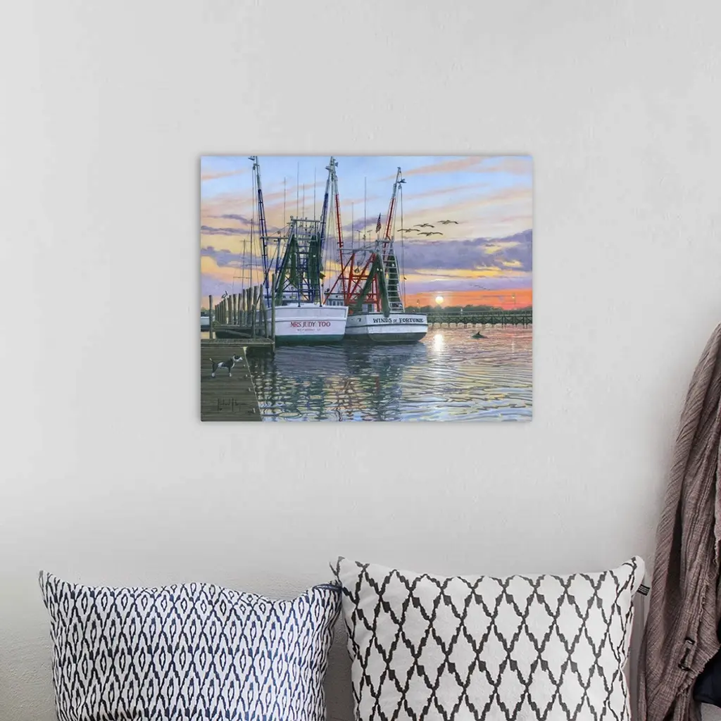 Contemporary artwork of two fishing oats sitting in a harbor at sunset.